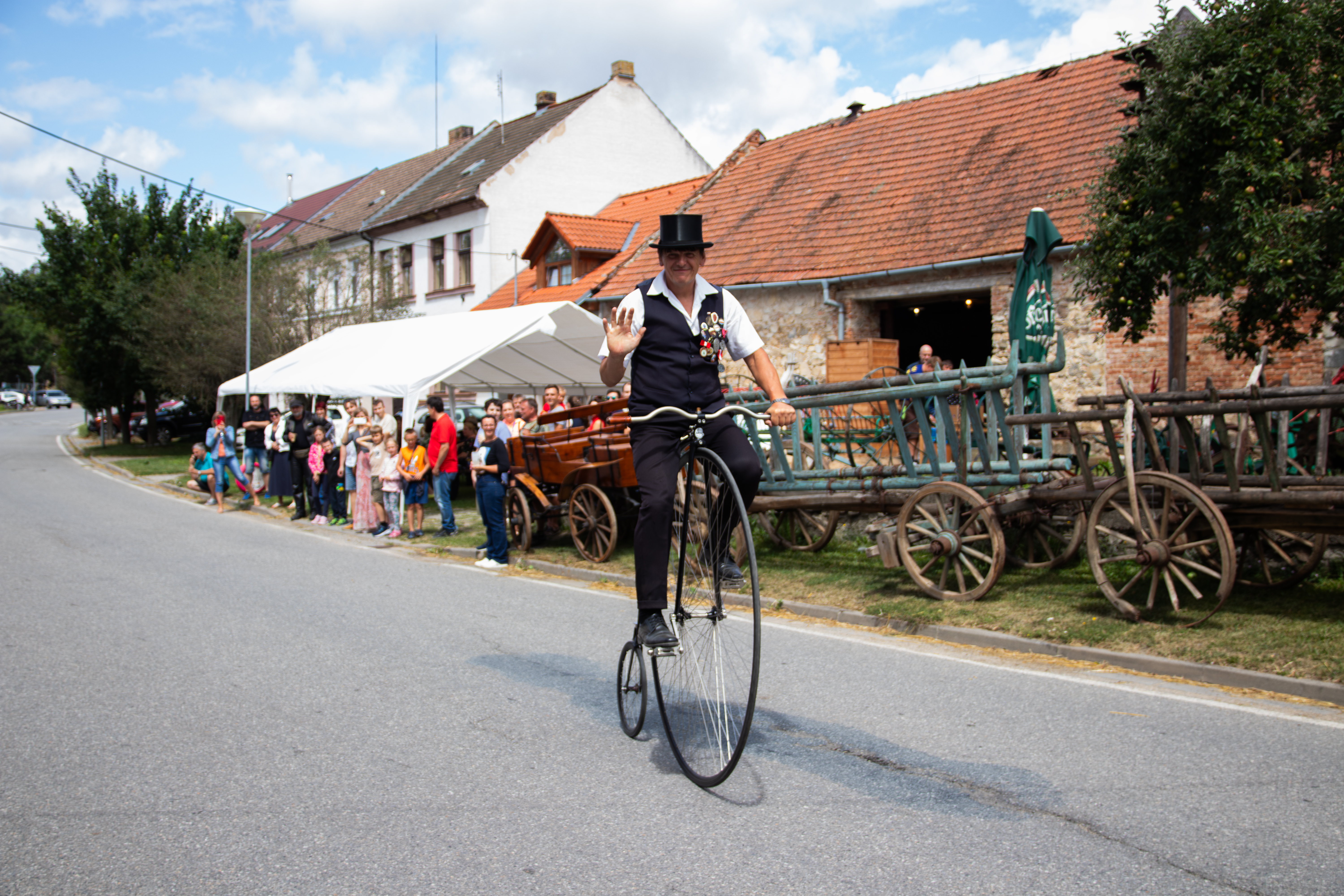 Pán mi řekl, že mě nepustí domů, dokud se na tom trochu nenaučím. Tak jsem tam asi dvacet minut jezdil, seskakoval, naskakoval. To šlo. Ale pak doma jsem se na to bál znovu nasednout. A ke všemu jsem neuváženě slíbil, že za tři dny přijedu do Netína na pouť předvádět jízdu na vysokém kole. Naštěstí v Netíně bylo tolik lidí, že tam na nějakou jízdu vůbec nebyl prostor, takže jsem na kolo jen naskakoval a seskakoval, aspoň tak stokrát, a vypadalo to, že to umím. Tak pěkně jsem to natrénoval, že dneska najdu stupačku i poslepu. Za rok následovala spanilá jízda z Balin. Zvládl jsem i náročnou cestu Balinským údolím. No a loni jsem byl na historickém dni ve Svratce, kde jsem se dozvěděl o jízdě na vysokých kolech z Vysokého Mýta do Vídně (u Velkého Meziříčí). Zkontaktoval jsem organizátora a tréninkově jsme vyrazili na jízdu z Vysokého Mýta do Přelouče, to byla pohoda, tam je rovina. A pak 100 km do Vídně. Tolik kilometrů v tahu jsem ještě nejel. Byla to krásná akce, jelo nás asi deset.