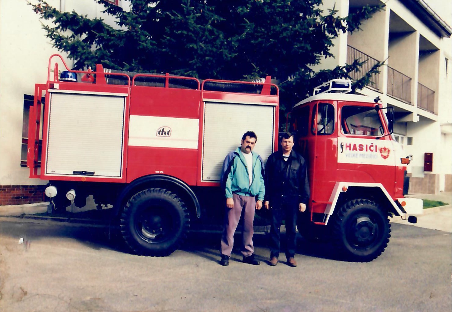 Jaroslav: To jsem byl tenkrát ještě hodně mladý, bylo mi sedmnáct nebo osmnáct. To tady ještě byla vozidla Praga RN. Výjezd to byl v noci, když hořely v Měříně dálniční ubikace. Vzpomínám si na to hlavně proto, že to byl výjezd, který mě hodně naučil. Když jsme přišli do hasičky, tak jsme se převlékali a ti starší chlapi na mě pořád křičeli: „Dělej, jedem!" Tak jsem vyrazil a když jsem sedl do Ereny, tak jsem zjistil, že nemám boty. Tak jsem se naučil, že nemám být moc hrrr a přemýšlet u toho.