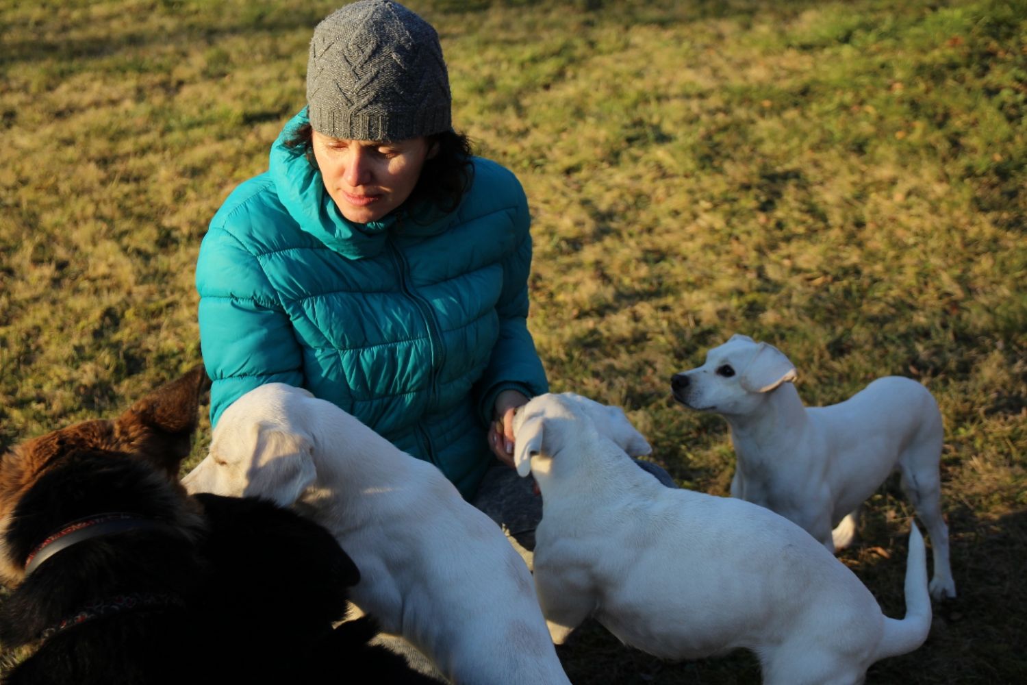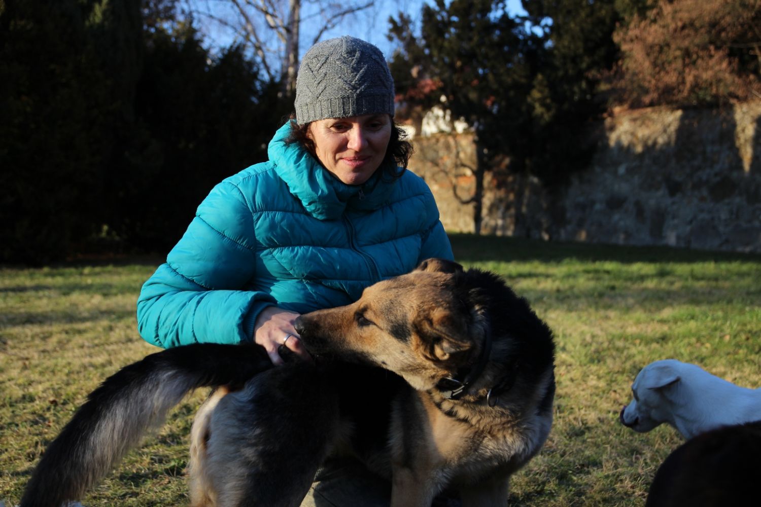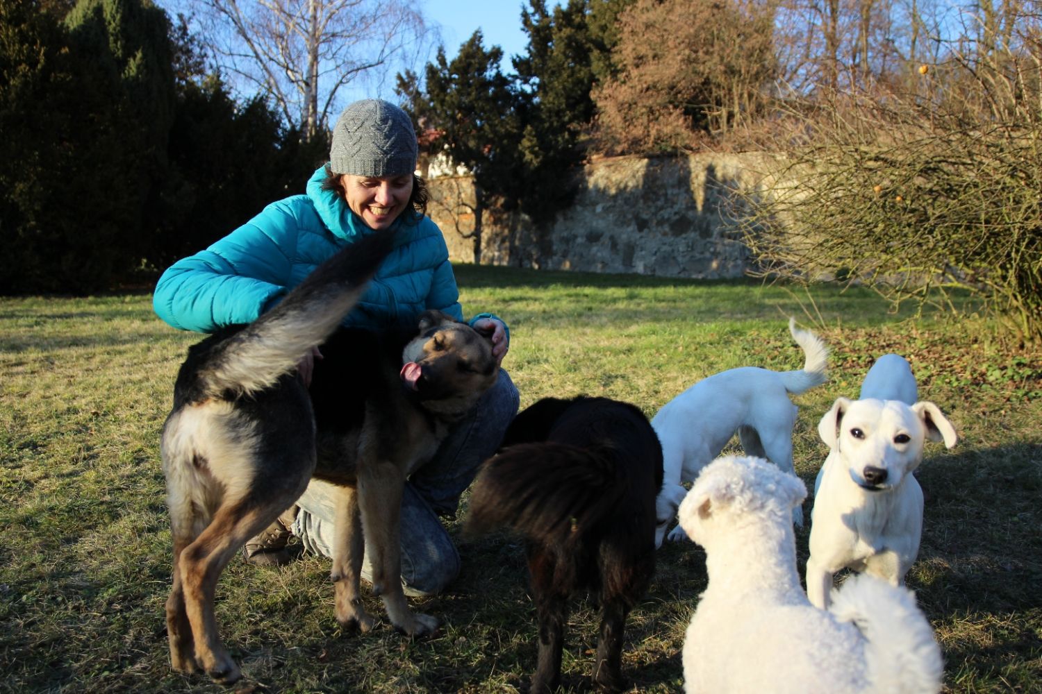 Některý je povahou přátelský, přijde za vámi hned sám. S jiným je to složité. Zpočátku je zavřu do kotce. Několikrát denně za nimi chodím, dám jim jména a mluvím na ně, dávám jim pamlsky, postupně si zvykají a pomalu reagují. Poznám často, na koho byl pes fixovaný – na muže, na ženu. Je vidět, který žil doma a ne venku. Časem i poznám, jak s ním kdo zacházel. Třeba tuhle fenu nejspíš někdo mlátil klackem, protože když jsem vzala do ruky koště, začala se bát. Se psy zvyklými na obojek chodím i ven, do města, někam na vycházku. Některé vzít nemůžu, neposlouchají. Mohou být jen zavření na zahradě.