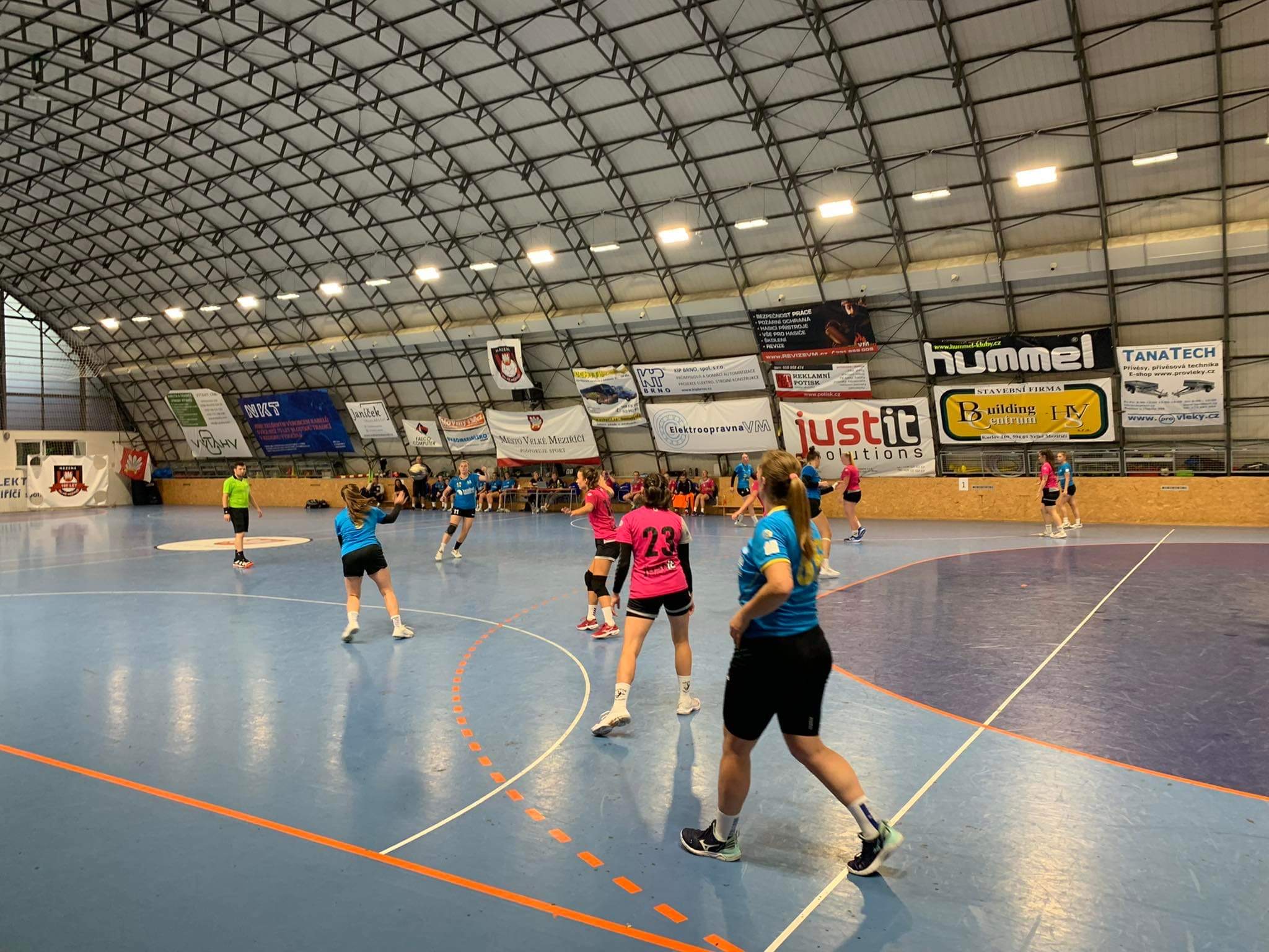 V úvodu zápasu byl kladen důraz spíše na obrany obou celků, o tom svědčilo i skóre 3:4 v 11. minutě. Poté se soupeřkám podařilo dát 3 rychlé góly a ujaly se vedení. Domácí hráčky se ale nenechaly zaskočit, a začaly hledat brankové příležitosti hlavně v křídelních prostorech a z rychlých protiútoků. V posledních vteřinách před poločasem se jim podařilo dotáhnout na nejtěsnější rozdíl. A tak se šlo do šaten za téměř vyrovnaného stavu 12:13.