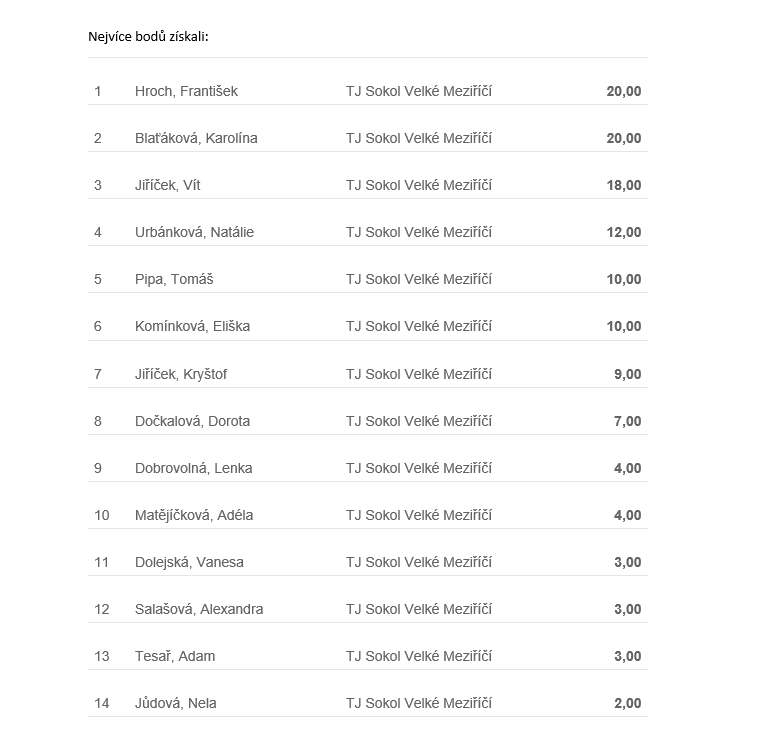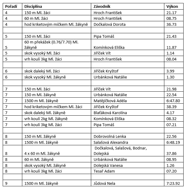 Na medailových pozicích se umístila Karolína Blaťáková za 3. místo v běhu na 60 m a skoku do dálky a Vít Jiříček za 3. místo na 1500 m. Úspěšné byly i naše štafety mladší žáci (Hroch, Pipa, Jiříček Vít, Jiříček Kryštof) a mladší žákyně (Komínková, Dobrovolná, Blaťáková, Urbánková) se umístili na 2. místě.