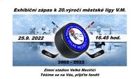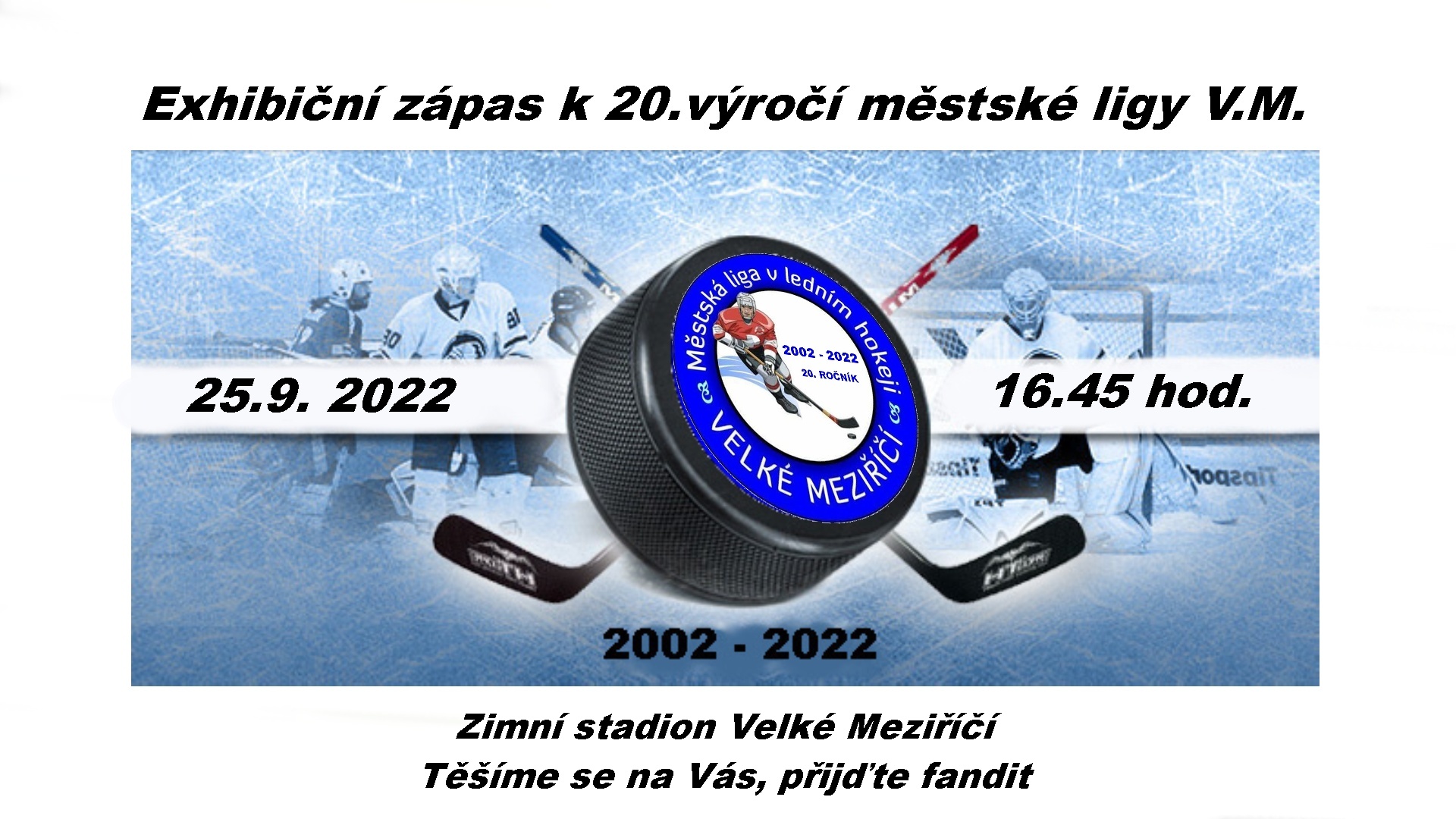 Městská liga Velké Meziříčí, vás zve na exhibiční zápas k jubilejnímu 20. ročníku. Zápas se uskuteční v neděli 25. září 2022 v 16:45 hodin na zimním stadionu ve Velkém Meziříčí.