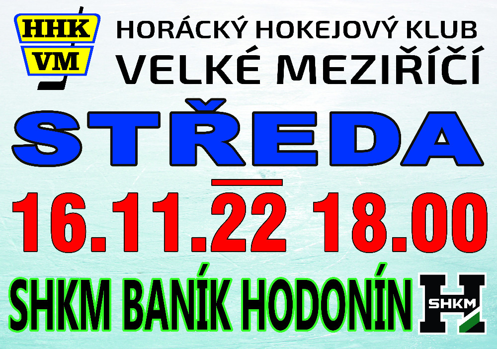 středa 16. 11. 2022 HHK Velké Meziříčí – SHKM Baník Hodonín, začátek utkání v 18:00 hodin (zimní stadion Velké Meziříčí)