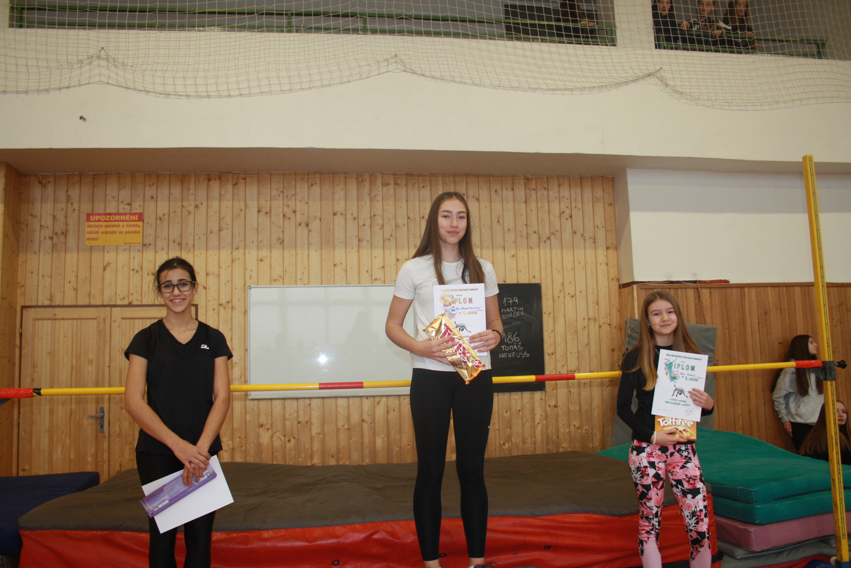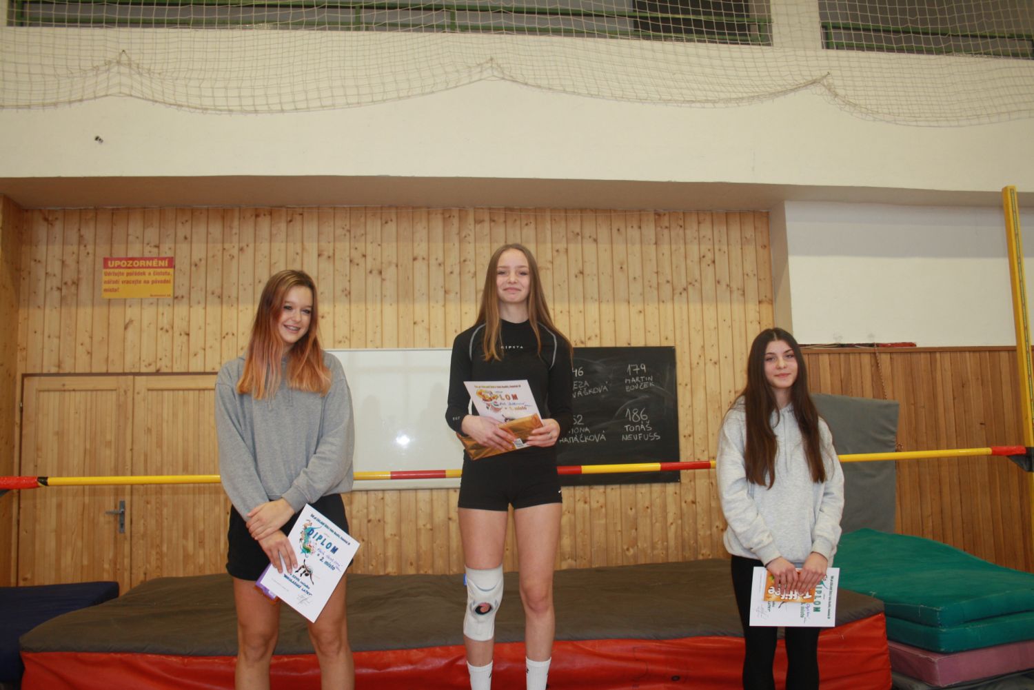 Mezi dívkami osmých tříd si nejlépe vedla Nela Wasserbauerová, která o pět centimetrů předčila na místě druhém Emu Příhodovou i třetí v pořadí Veroniku Koženou. Kategorie dívek devátých tříd zcela opanovala výkonem 140 cm Ester Böhmová, o deset centimetrů menší výkon předvedla v pořadí druhá Klára Havlišová, ocenění za třetí místo převzala za výkon 125 cm Terezie Chylíková.
