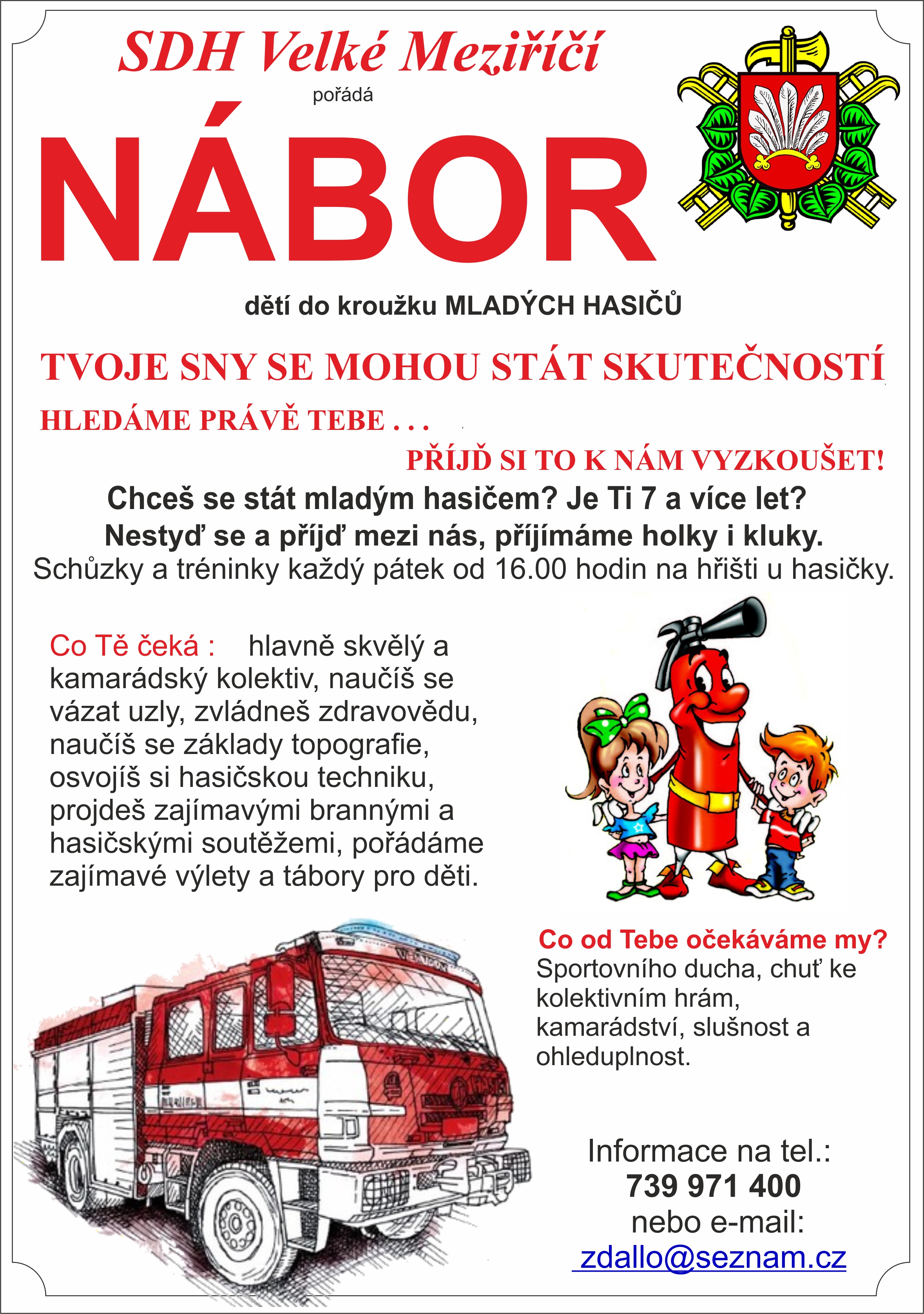 Dobrovolní hasiči v Meziříčí se rozhodli rozšířit své řady. Členem jejich sboru se může stát každý, komu již bylo alespoň 7 let, má sportovního ducha a má chuť se stát součástí týmu.