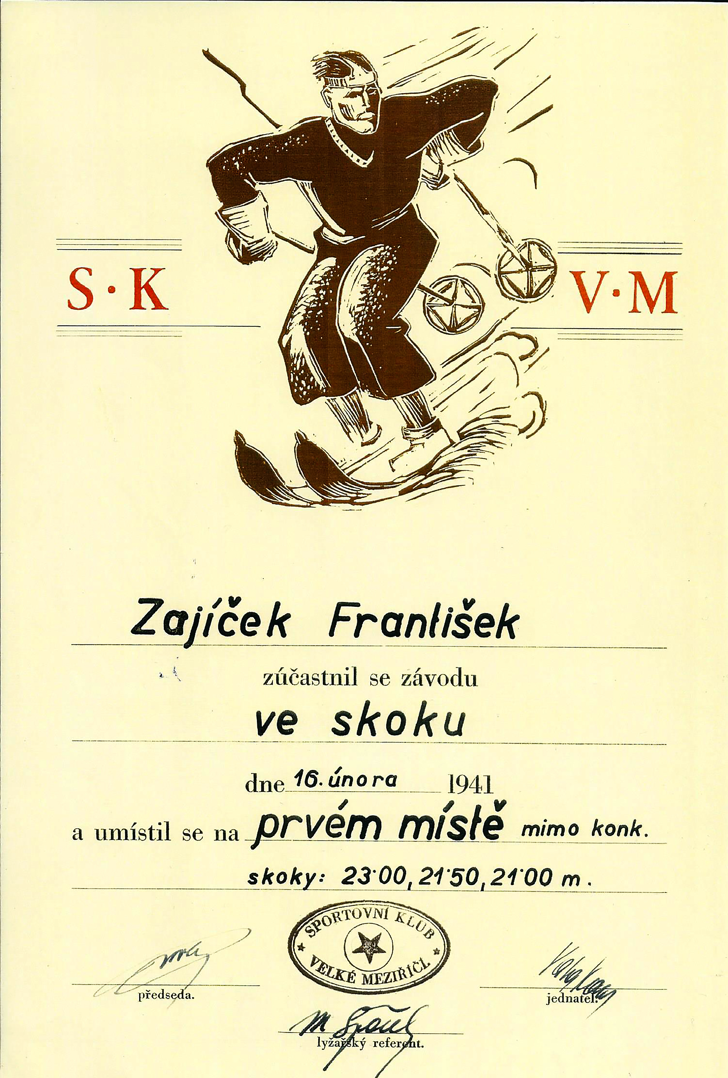Je prosinec roku 1939. Valnou hromadou Sportovního klubu Velké Meziříčí (SK VM) je zvolen za předsedu E. Procházka, ředitel Zemědělské nemocniční pojišťovny, a lyžařský odbor vede odborný učitel Jan Hlošek. František Zajíček odjíždí do Garmisch‑Parkenkirchenu (Ga‑Pa), kde jejich štafeta ve složení Kosour, Zajíček, Musil obsazuje 3. místo. Ve Velkomeziříčsku je ze dne 10. 2. 1940 zveřejněn tento komentář: „Mezinárodních závodů v Ga‑Pa zúčastnil se v mužstvu Protektorátu Čechy a Morava také náš krajan František Zajíček, úředník Okresního úřadu ve Velkém Meziříčí, instruktor našeho lyžařského kurzu," Z Ga‑Pa poslal svému šéfovi, panu radovi Cagašovi, pozdravný lístek, na kterém jsou podepsáni téměř všichni lyžaři: Jarolím, Šponar, Balvín, Beinhaerová atd.