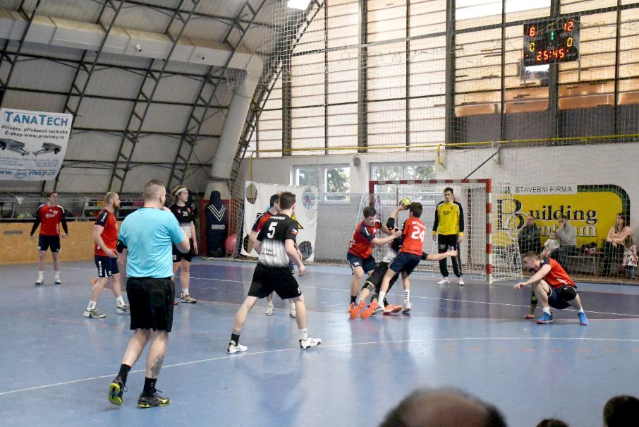 Na soupeře, který disponuje nejproduktivnějším útokem soutěže, jsme hned od úvodu aplikovali aktivní obranu 1 – 5, která hostím dělala velké potíže, a my tak šli v úvodu do vedení (6. minuta 3:1). Následovala ovšem série našich vyloučení a favorit začal otáčet skóre ve svůj prospěch. Navíc když v 18. minutě viděl po 3. vyloučení červenou kartu náš nejlepší střelec Večeřa, nevypadalo to s námi dobře. Naše čtyřminutové oslabení Ivančice dokonale využily a začínaly si budovat náskok (27. minuta 9:13). Ovšem závěrečné minuty jsme sehráli na výbornou a nebýt laciné branky v posledních vteřinách, mohla z toho být poločasová remíza.