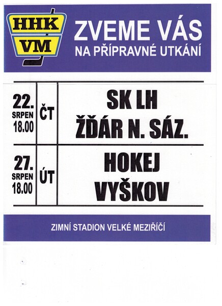Hokejisté HHK Velké Meziříčí dnes vyjedou opět na led k dalšímu přípravnému utkání. Od 18 hodin je čeká zápas s odvěkým rivalem SK LH Žďár nad Sázavou. Další přípravné utkání čeká velkomeziříčské hokejisty v úterý 27. srpna, kdy přivítají tým Hokej Vyškov.
