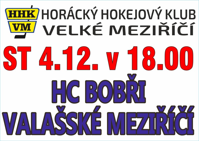 Dnes, tedy ve středu 4. prosince, v 18 hodin nastoupí hokejisté HHK Velké Meziříčí k dalšímu domácímu utkání. Dnes je čeká meziříčské derby. Na stadion k řece Oslavě přijedou od Rožnovské Bečvy hokejisté HC Bobři Valašské Meziříčí.