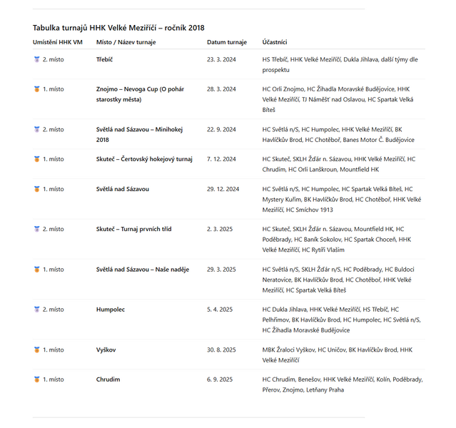 Mladí hokejisté HHK Velké Meziříčí – 2. třída, ročník 2018 pokračují ve své skvělé jízdě po tuzemských turnajích. Tento tým patří k nejúspěšnějším ve své kategorii a pravidelně obsazuje přední příčky.