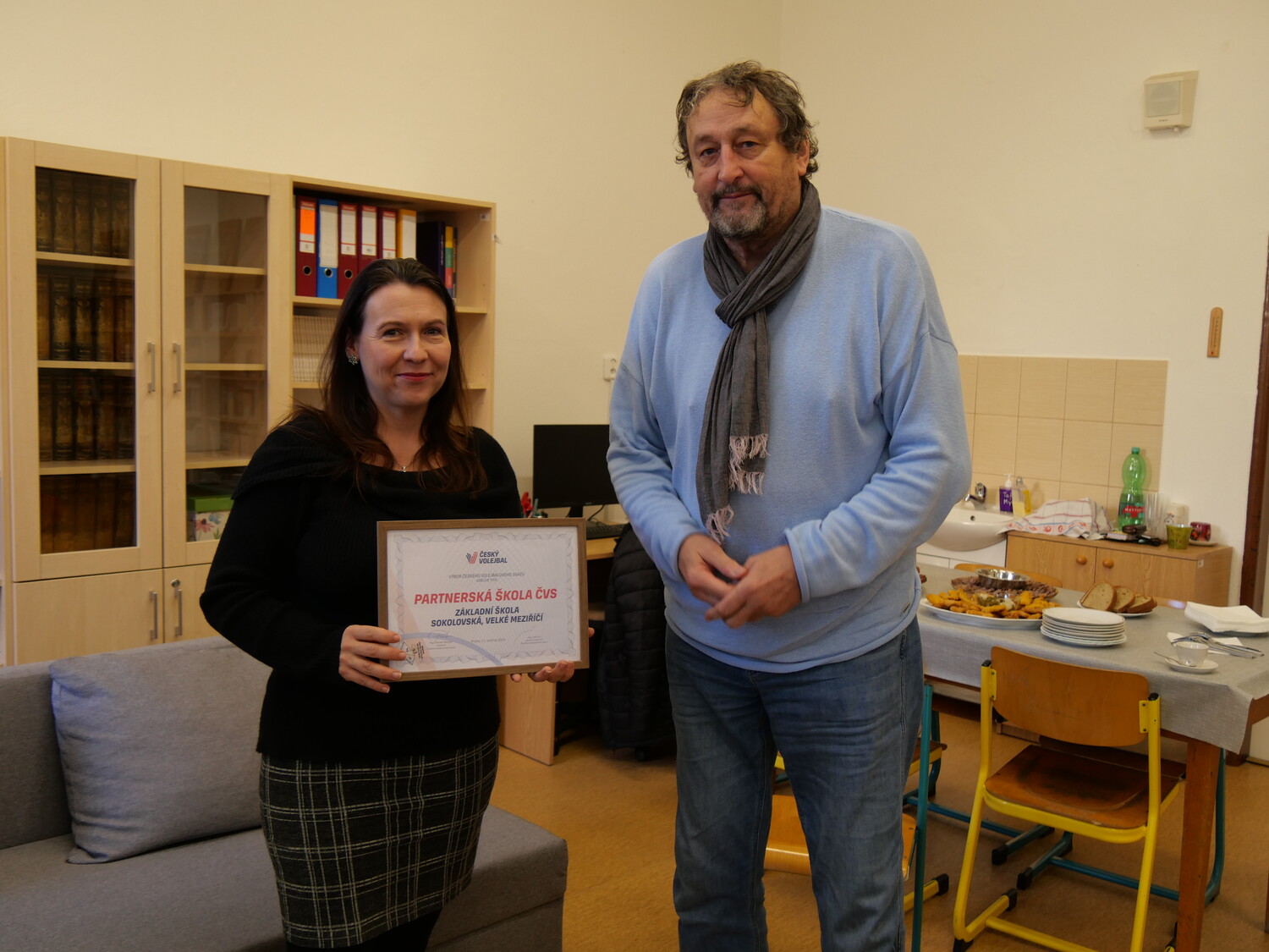 Ve čtvrtek 18. listopadu dopoledne zavítal do Základní školy Sokolovská volejbalový svazový trenér mládeže Jiří Zach v doprovodu velkomeziříčského volejbalového trenéra a radního Petra Judy. Důvodem jejich návštěvy bylo předání titulu Partnerská škola ČVS (Český volejbalový svaz) do rukou ředitelky školy Hedviky Kopečné.