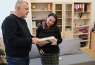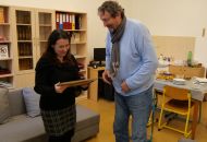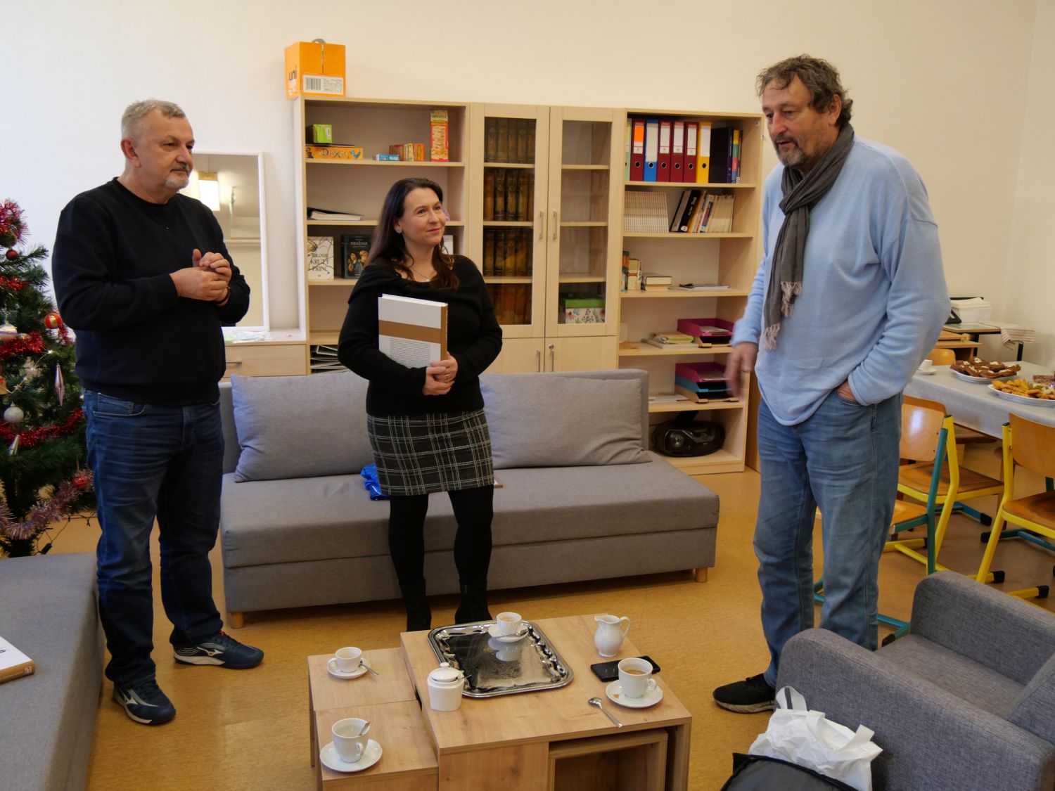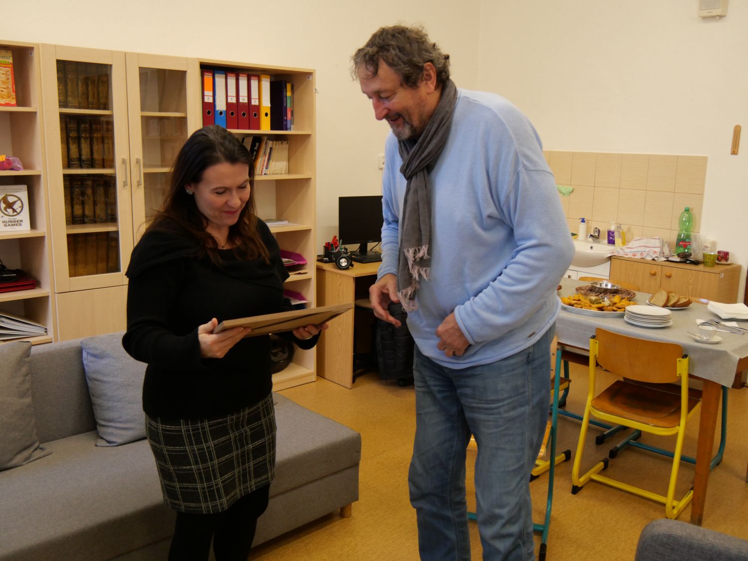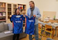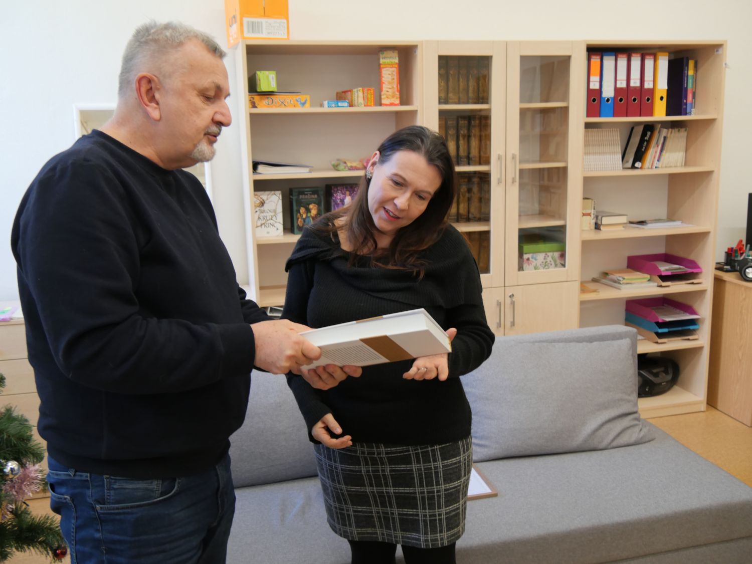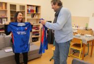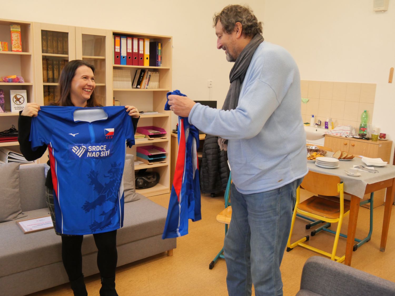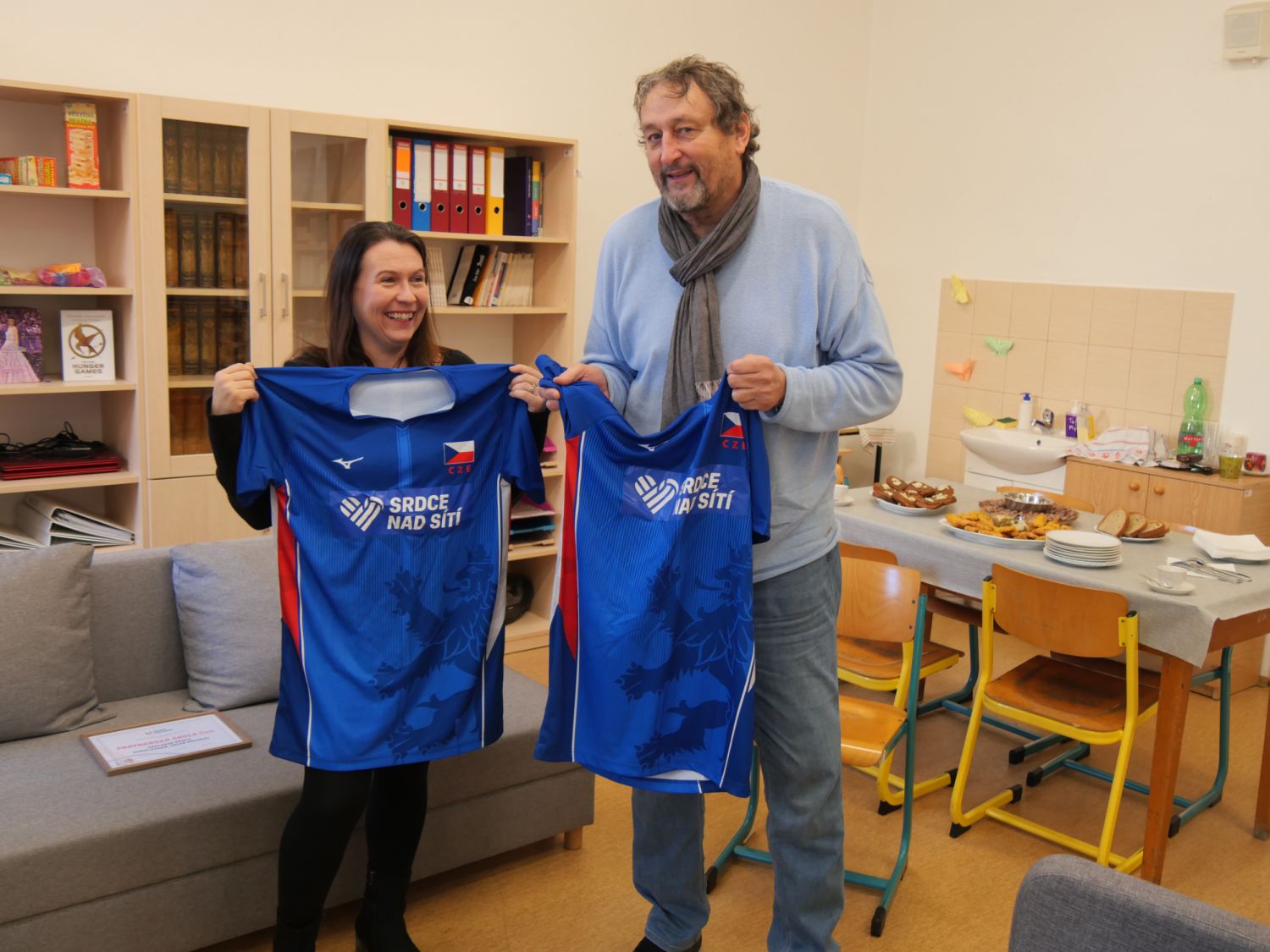 Ředitelka školy Hedvika Kopečná převzala z rukou Jiřího Zacha nejen certifikát o udělení titulu, ale také dres volejbalové reprezentace a od Petra Judy výpravnou publikaci Zlatá kniha volejbalu.