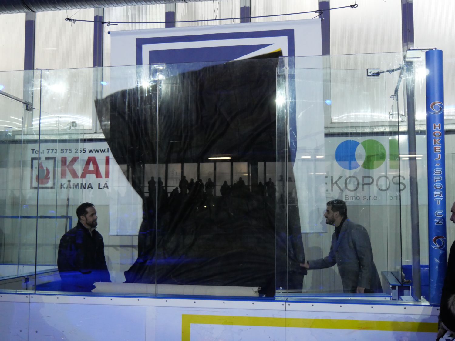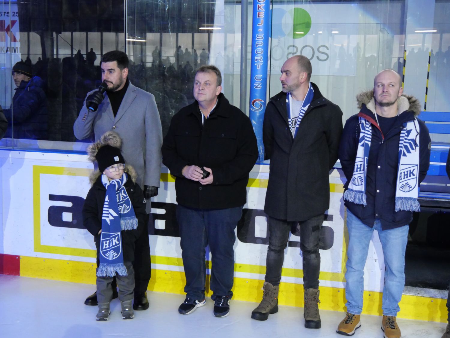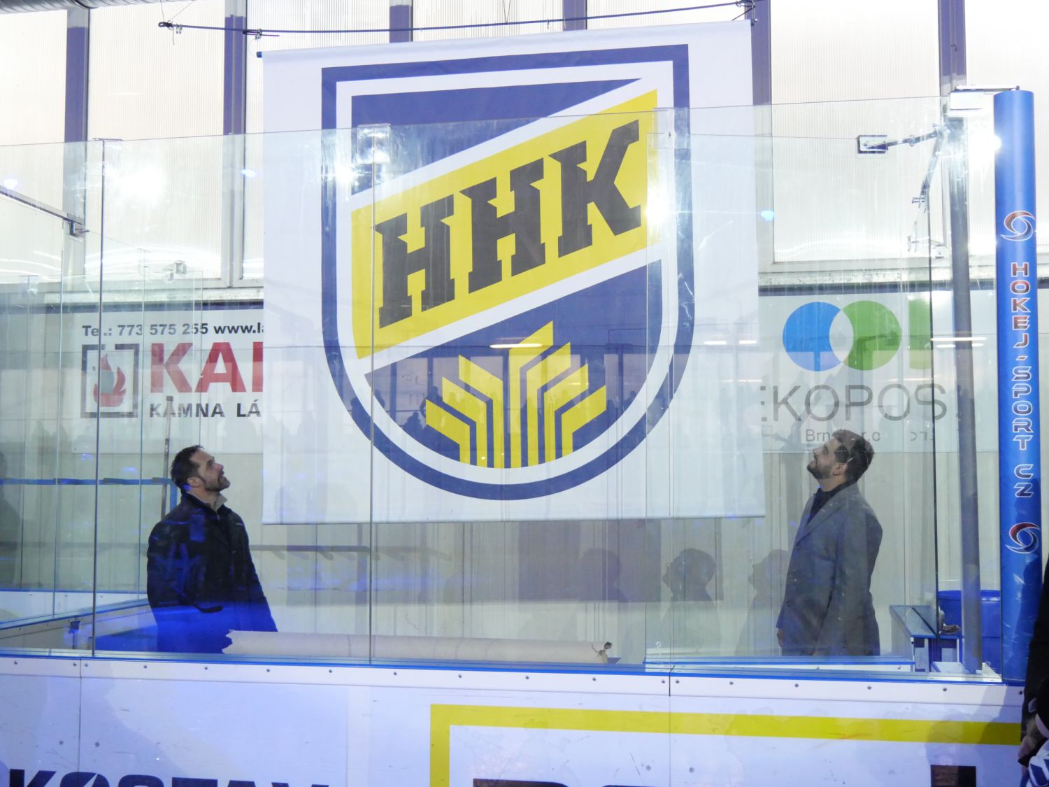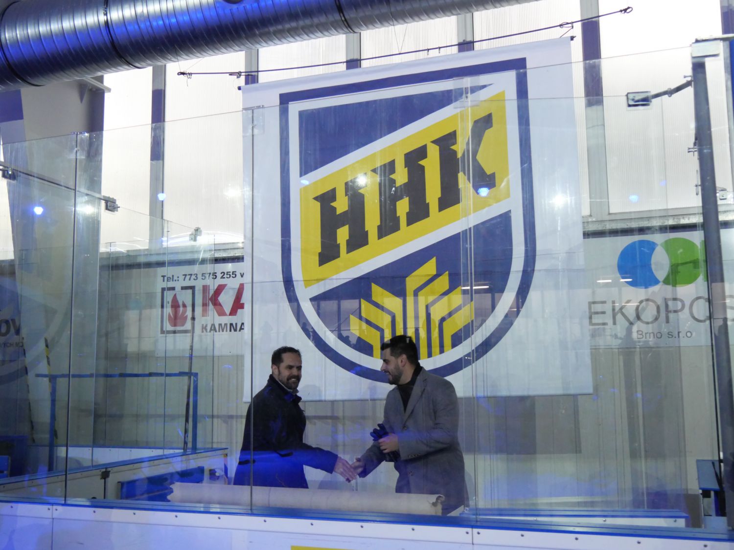 A pak přišel slavnostní okamžik, kdy starosta města Alexandros Kaminaras spolu s Tomášem Rolínkem odhalili nové logo Horáckého hokejového klubu Velké Meziříčí.