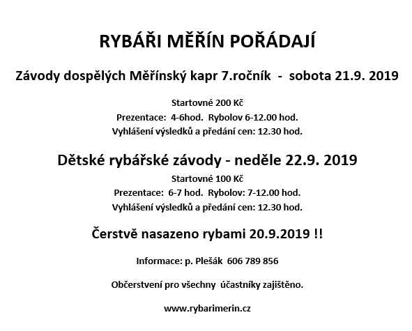 Měřínský kapr se člení na závody dospělých a dětské rybářské závody. Dospělým bude patřit sobota 21. září a dětem neděle 22. září 2019.