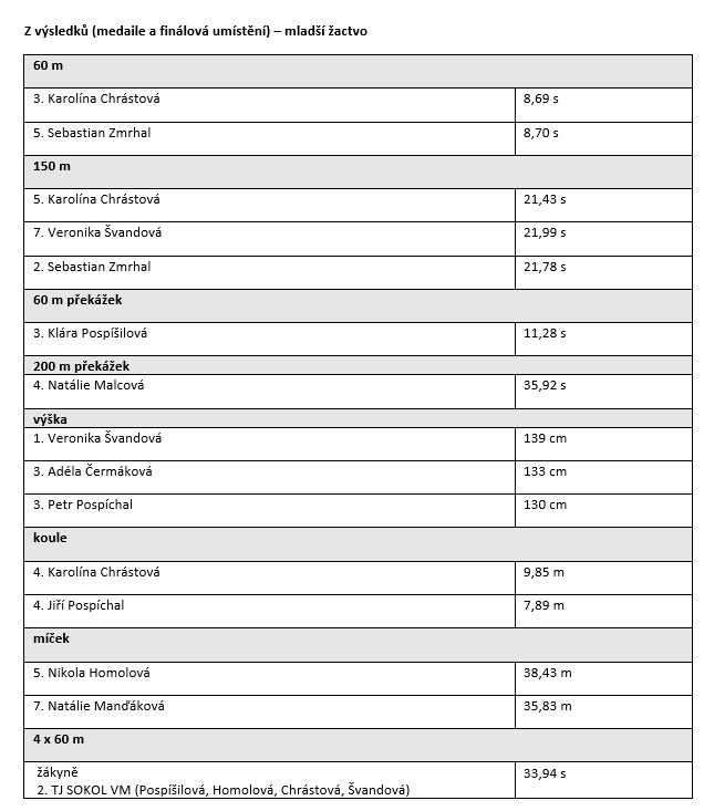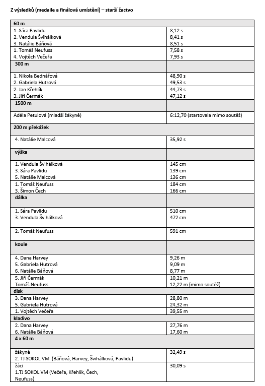 K nejúspěšnějším patřili Tomáš Neufuss (tituly na 60 m a ve výšce, stříbro v dálce), Sára Pavlidu (tituly na 60 m a v dálce, bronz ve výšce), Vendula Švihálková (titul ve výšce, stříbro na 60 m a bronz v dálce) a Dana Harvey (stříbro v kladivo a bronz v disku).