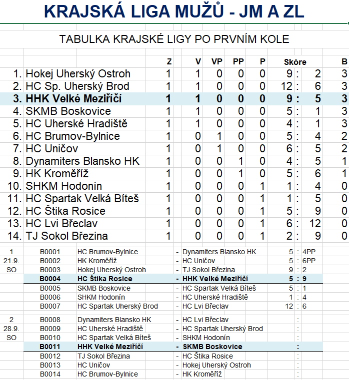 Ostatní výsledky prvního kola: HK Kroměříž – HC Uničov 5:6PP, SKMB Boskovice – HC Spartak Velká Bíteš 5:1, HC Spartak Uherský Brod – HC Lvi Břeclav 12:6, HC Brumov-Bylnice – Dynamiters Blansko HK 5:4PP, Hokej Uherský Ostroh – TJ Sokol Březina 9:2, SHKM Hodonín – HC Uherské Hradiště 1:4.