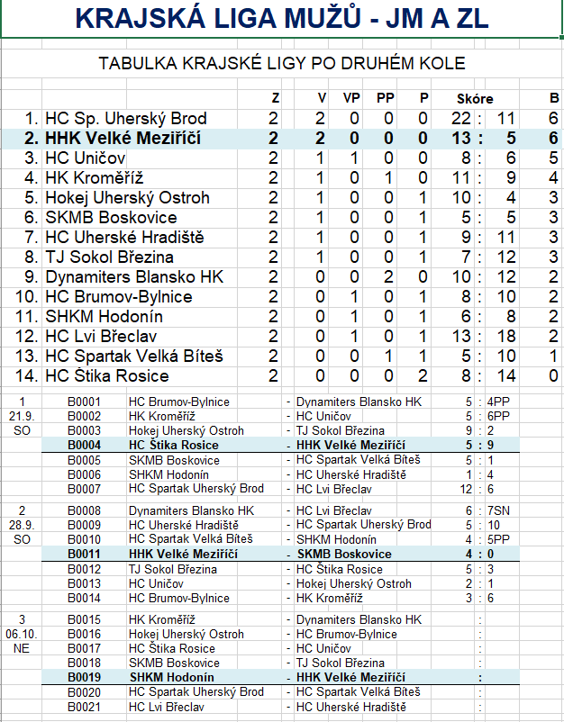 Utkání druhého kola Krajské ligy mužů Jižní Moravy a Zlínska mezi Velkým Meziříčím a Boskovicemi bylo dlouho vyrovnané. Až do 37. minuty vládli na ledové ploše gólmani. Velkomeziříčští rozhodli o svém vítězství čtyřmi brankami během osmi minut na přelomu druhé a třetí třetiny. V 37. minutě v přesilové hře vystřelil od modré čáry Roman Kadela. Jeho střelu před gólmanem Huzlíkem tečoval Patrik Matov a poslal domácí do vedení - 1:0. Druhou branku přidal po rychlém úniku po levém mantinelu třináct vteřin před koncem druhé třetiny Richard Peschout - 2:0. Třetí část začala stejně, jako končila druhá. 23 vteřin po jejím začátku vedli domácí o tři branky, když Roman Kadela bleskově objel boskovickou branku a našel skulinu mezi tyčkou a betonem - 3:0. Finální podobu výsledku dal ve 44. minutě Martin Pejchal - 4:0.