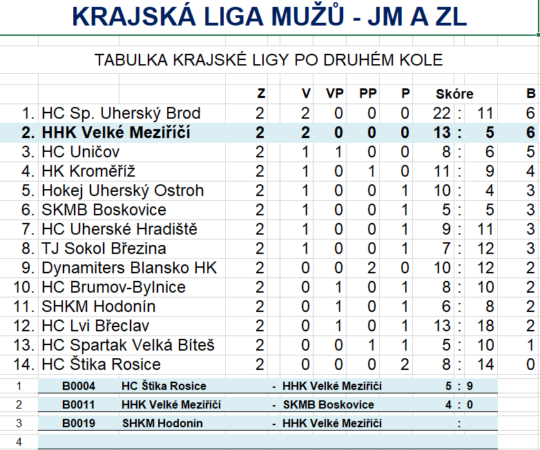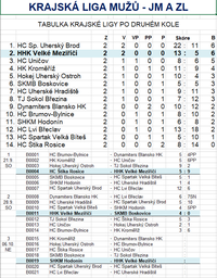Ostatní výsledky druhého kola: HC Spartak Velká Bíteš – SHKM Hodonín 4:5PP, TJ Sokol Březina – HC Štika Rosice 5:3, Dynamiters Blansko HK – HC Lvi Břeclav 6:7SN, HC Uherské Hradiště – HC Spartak Uherský Brod 5:10, HC Brumov-Bylnice – HK Kroměříž 3:6, HC Uničov – Hokej Uherský Ostroh 2:1.