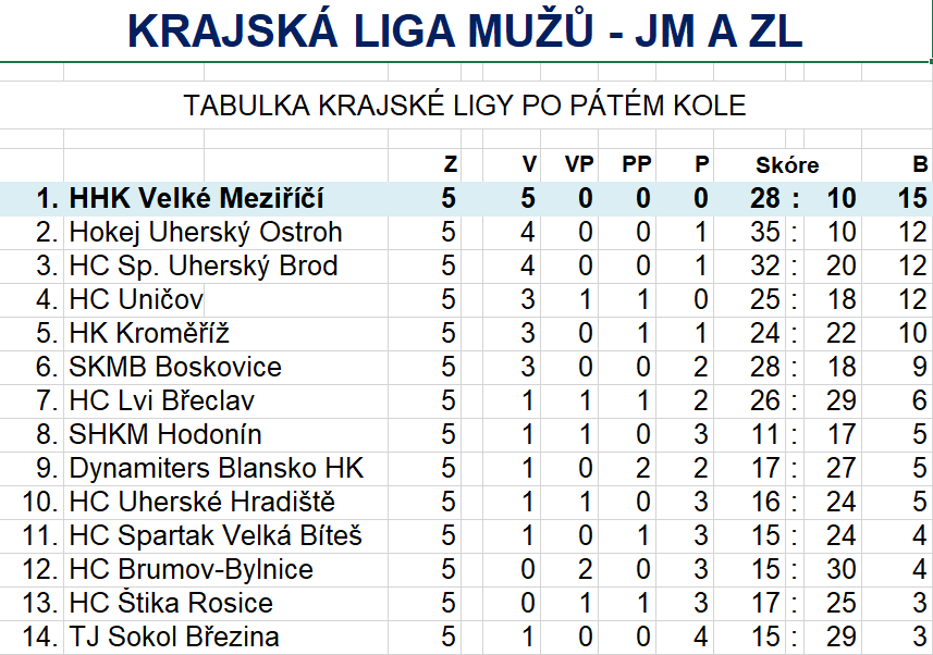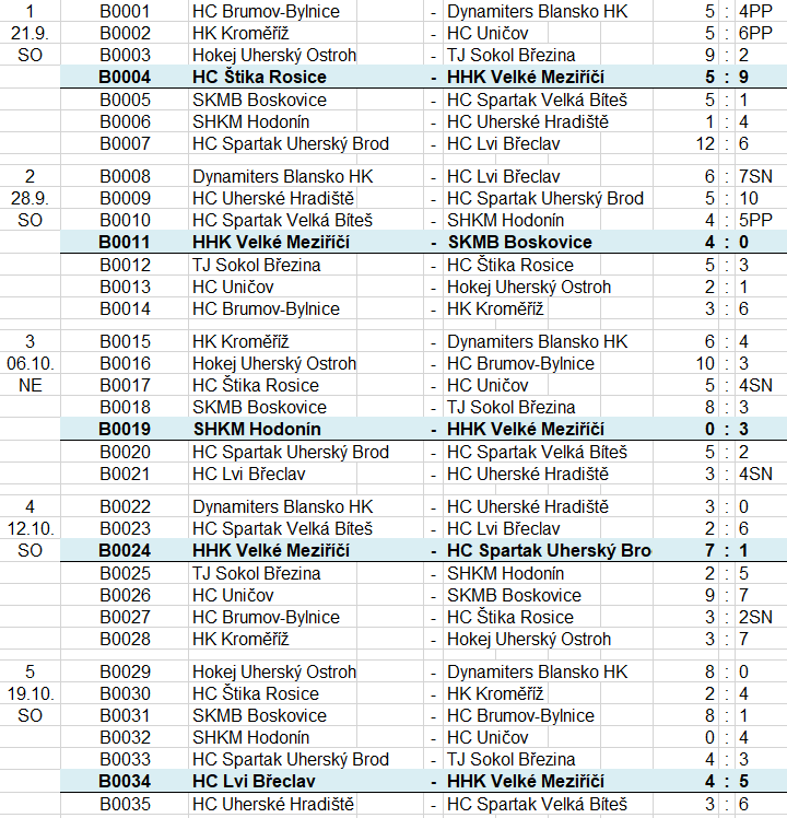 Ostatní výsledky pátého kola: HC Štika Rosice – HK Kroměříž 2:4, SKMB Boskovice – HC Brumov-Bylnice 8:1, HC Spartak Uherský Brod – TJ Sokol Březina 4:3, HC Uherské Hradiště – HC Spartak Velká Bíteš 3:6, Hokej Uherský Ostroh – Dynamiters Blansko HK 8:0, SHKM Hodonín – HC Uničov 0:4.
