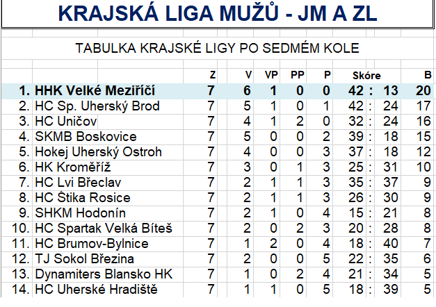 Ostatní výsledky sedmého kola: HC Štika Rosice – Dynamiters Blansko HK 5:3, SKMB Boskovice – Hokej Uherský Ostroh 4:0, SHKM Hodonín – HK Kroměříž 2:1, HC Spartak Uherský Brod – HC Brumov-Bylnice 8:0, HC Lvi Břeclav – HC Uničov 4:6, HC Uherské Hradiště – TJ Sokol Březina 1:5.