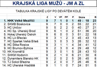 Ostatní výsledky devátého kola: SKMB Boskovice – Dynamiters Blansko HK 10:2, SHKM Hodonín – HC Štika Rosice 5:6, Hokej Uherský Ostroh – HC Spartak Uherský Brod 11:3, HC Lvi Břeclav – HK Kroměříž 6:1, HC Uherské Hradiště – HC Brumov-Bylnice 4:6, HC Spartak Velká Bíteš – HC Uničov 1:2PP.