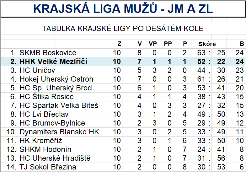 Ostatní výsledky desátého kola: Dynamiters Blansko HK – TJ Sokol Březina 7:4, HK Kroměříž – HC Uherské Hradiště 5:7, Hokej Uherský Ostroh – HC Lvi Břeclav 7:4, SKMB Boskovice – SHKM Hodonín 8:3, HC Brumov-Bylnice – HC Spartak Velká Bíteš 0:1, HC Štika Rosice – HC Spartak Uherský Brod 4:2.