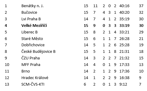 Nyní po týdenní přestávce bude 1. liga pokračovat. Hrát budeme opět doma. V pátek 6.12. od 19.30 s B týmem Českých Budějovic (první zápas 0:3) a v sobotu 7.12.od 18.00 hod. s Dobřichovicemi (2:3). Rok zakončíme další týden v Praze s MFF a B týmem Lvů.