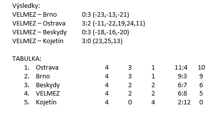 V pořadí třetí turnaj (z pěti) extraligy juniorů máme za sebou. Nedopadl pro nás dobře, co se týká výsledku. Prohráli jsme s Brnem (to se čekalo), ale i s Beskydy. To se nečekalo ovšem, vzhledem k předvedené hře, zcela zaslouženě. Na druhé straně jsme porazili Ostravu, když jsme otočili z 0:2 na 3:2. Nakonec jsme porazili i Kojetín v boji plném dramatických koncovek 3:0.