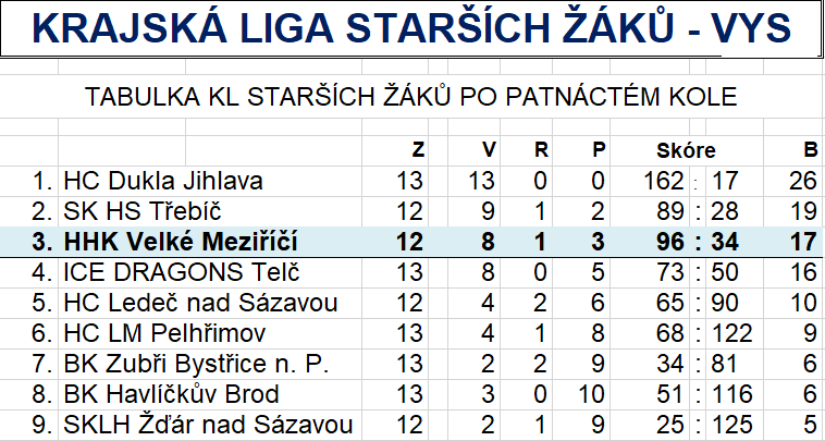 Sobota 18. 12. 2019 HHK VM starší žáci – SK HS Třebíč, začátek utkání v 16:45 hod. (zimní stadion Velké Meziříčí)
