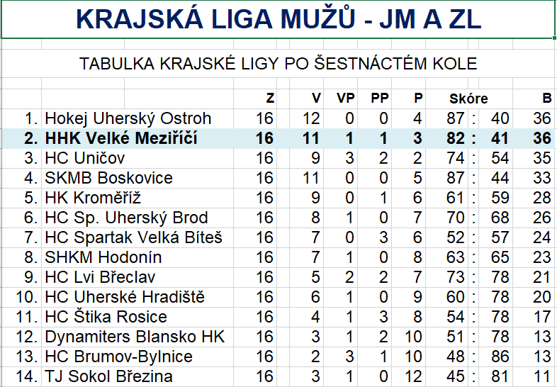 Ostatní výsledky šestnáctého kola: Dynamiters Blansko HK – HK Kroměříž 1:3, HC Brumov-Bylnice – Hokej Uherský Ostroh 2:4, HC Uničov – HC Štika Rosice 5:2, TJ Sokol Březina – SKMB Boskovice 0:4, HC Spartak Velká Bíteš – HC Spartak Uherský Brod 7:0, HC Uherské Hradiště – HC Lvi Břeclav 3:1.