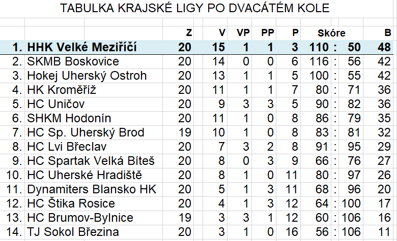 Ostatní výsledky dvacátého kola: Dynamiters Blansko HK – HC Štika Rosice 6:2, HK Kroměříž – SHKM Hodonín 1:2 Hokej Uherský Ostroh – SKMB Boskovice 2:5, HC Uničov – HC Lvi Břeclav 4:5PP, TJ Sokol Březina – HC Uherské Hradiště 1:8 HC Brumov-Bylnice – HC Spartak Uherský Brod odloženo na 20.2.2020.