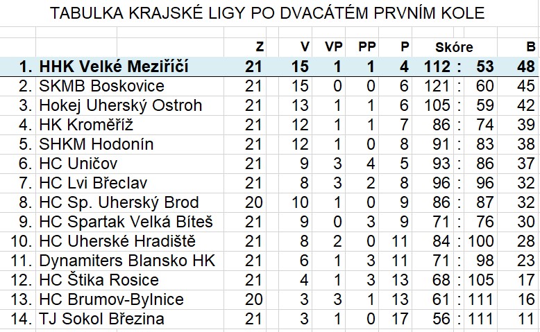 Ostatní výsledky dvacátého prvního kola: HC Spartak Velká Bíteš – TJ Sokol Březina 5:0, HC Uherské Hradiště – HC Uničov 4:3PP, HC Lvi Břeclav – HC Brumov-Bylnice 5:1, HC Spartak Uherský Brod – HK Kroměříž 3:6, SHKM Hodonín – Hokej Uherský Ostroh – 5:4, SKMB Boskovice – HC Štika Rosice 5:4.