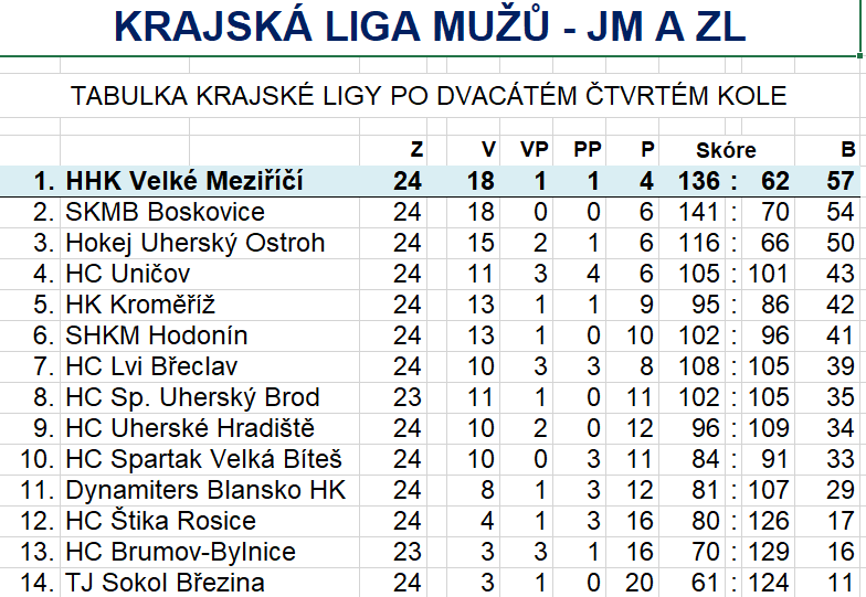 Ostatní výsledky dvacátého čtvrtého kola: Dynamiters Blansko HK – SHKM Hodonín 5:2, SKMB Boskovice – HC Spartak Uherský Brod 11:4, HC Štika Rosice – HC Lvi Břeclav 5:6, Hokej Uherský Ostroh – HC Uherské Hradiště 4:0, HK Kroměříž – HC Spartak Velká Bíteš 6:3, HC Uničov – TJ Sokol Březina 3:1.
