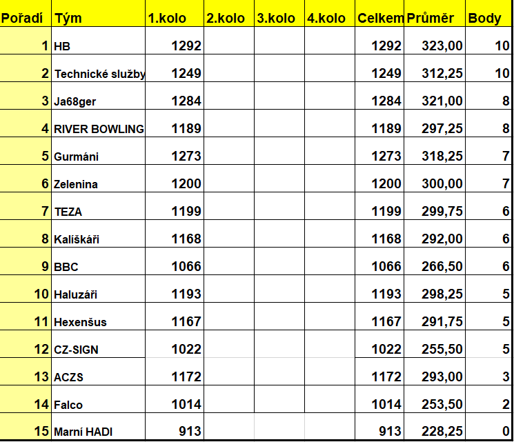 Hráči bowlingu odehráli první hrací den prvního kola Zveřejněno 18. 2. 2020 10:46 První hrací den prvního kola: 1. HB2. Jager3. Gurmáni Nához Šmitka 207 Poslat článek příteli