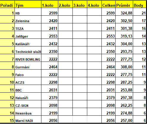 Hráči bowlingu odehráli druhý hrací den prvního kola Zveřejněno 4. 3. 2020 8:52 Druhý hrací den prvního kola: 1. HB2. Jager3. Kalíškáři Nához Smejkal Libor 222 Lomikar Poslat článek příteli
