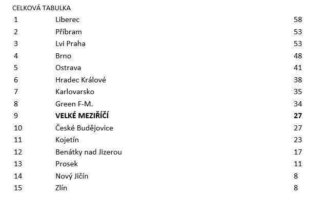 Celkově jsme tedy skončili na devátém místě. Mohlo by se říci, že proti loňskému 11. místu to zase nebylo nic moc. Ona se sezona nedá hodnotit pouze podle konečného umístění, ale i podle jiných měřítek. Zatímco v loňské sezoně jsme vyhráli pouze jednou, letošní bilance byla z 20 zápasů 13 vítězných a 7 porážek. Tedy bilance pozitivní. Turnajový systém mohl způsobit, že výše postavené týmy mohou mít daleko méně vítězství než třeba my. Záleží do jakých výkonnostních skupin se probojovávaly. My po rozřaďovacím turnaji s bilancí 1:3 šli do třetí. Tu jsme vyhráli s poměrem 4-0 a postoupili do druhé. Tam při dvou vítězství a dvou porážkách opět spadli o skupinu níže, kterou jsme opět vyhráli (3-1) a po postupu jsme v posledním turnaji opět s bilancí 3:1 skončili na 1. místě druhé skupiny.