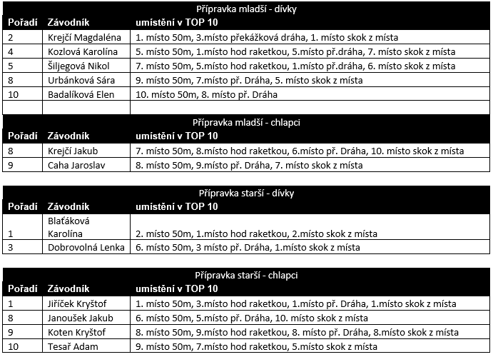 Kategorii starších hochů vyhrál Kryštof Jiříček, starší dívky Karolína Blaťáková. Na 2. místě se umístila Magdaléna Krejčí z ml. děvčat a na 3. místě Lenka Dobrovolná z děvčat starších. Karolíně Kozlové utekly stupně vítězů o 0,5 bodu a Nikol Šiljegové o 1 bod, děvčata tak odjela se 4. a 5. místem.