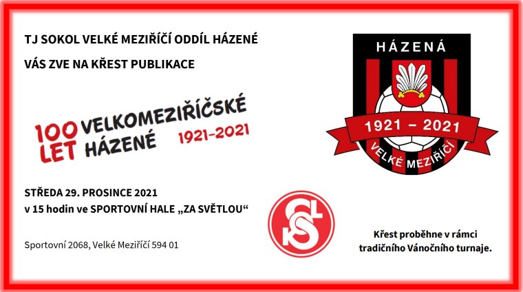 Ve středu 29. prosince 2021 se na házenkářské hale kromě turnaje uskuteční KŘEST PUBLIKACE 100 LET VELKOMEZIŘÍČSKÉ HÁZENÉ, a to v 15 hodin.