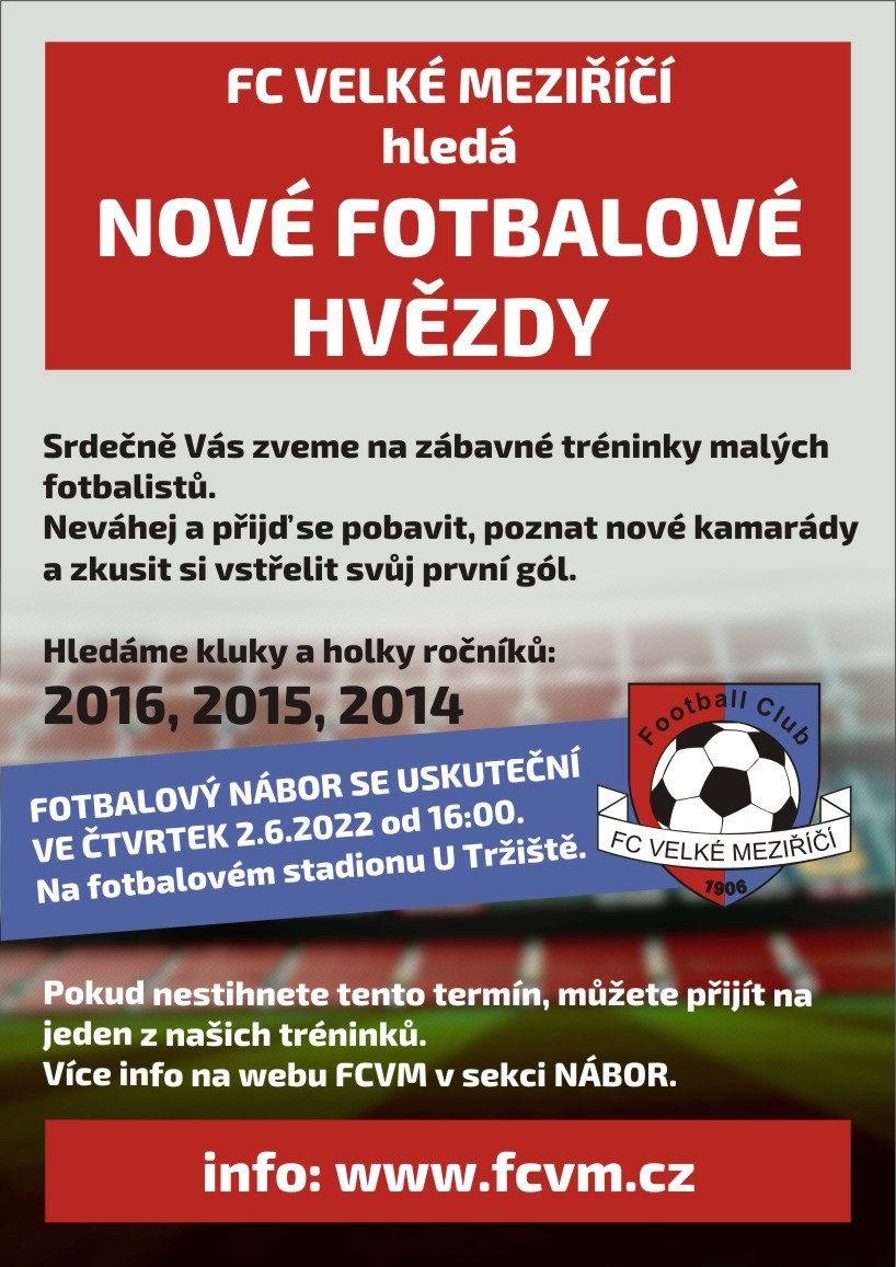 Baví tě hrát fotbal a jsi ročník 2014, 2015 nebo 2016? Tak máme právě pro tebe dobrou zprávu. Ve čtvrtek 2. června proběhne od 16 hodin na stadionu U Tržiště fotbalový nábor.