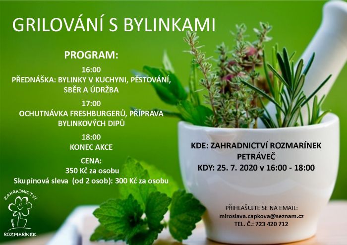 Workshop se uskuteční při závazném přihlášení 15 osob. Cena za jednotlivce 350,- , skupinová sleva (od 2 osob) 300,- V průběhu večera je možná samostatná prohlídka ukázkových zahrad, získání informací ohledně automatických závlah, péče o trávník, robotických sekaček (Petr Rozmarín). O výzdobu stolů se postará naše milá kreativní Bc. Miroslava Čapková.