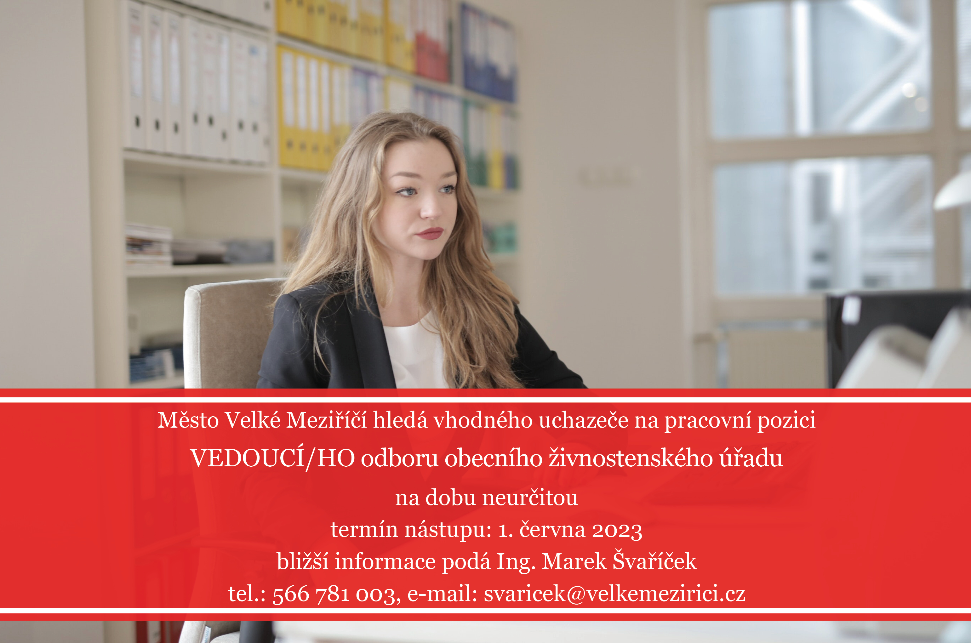 Tajemník Městského úřadu Velké Meziříčí vyhlašuje výběrové řízení na pozici vedoucí/ho odboru obecního živnostenského úřadu.