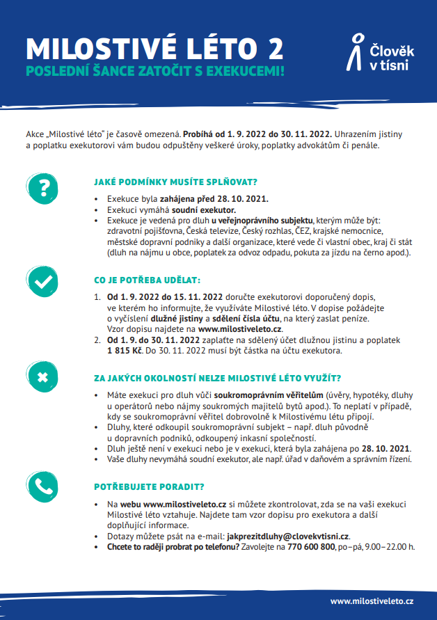 - Na webu milostiveleto.cz si můžete zkontrolovat, zda se na vaši exekuci Milostivé léto vztahuje. Najdete tam další doplňující informace.