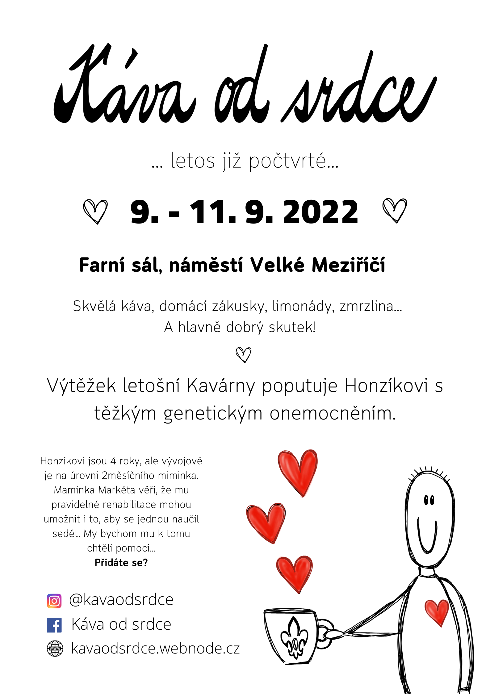 Čtvrtý ročník dobročinné akce, kterou pořádají skauti z Velkého Meziříčí, se blíží. Akce se uskuteční od 9. do 11. září ve farním sále ve Velkém Meziříčí, Náměstí 16/18. Přes den můžete navštívit kavárnu, ta se však večer přemění na čajovnu.