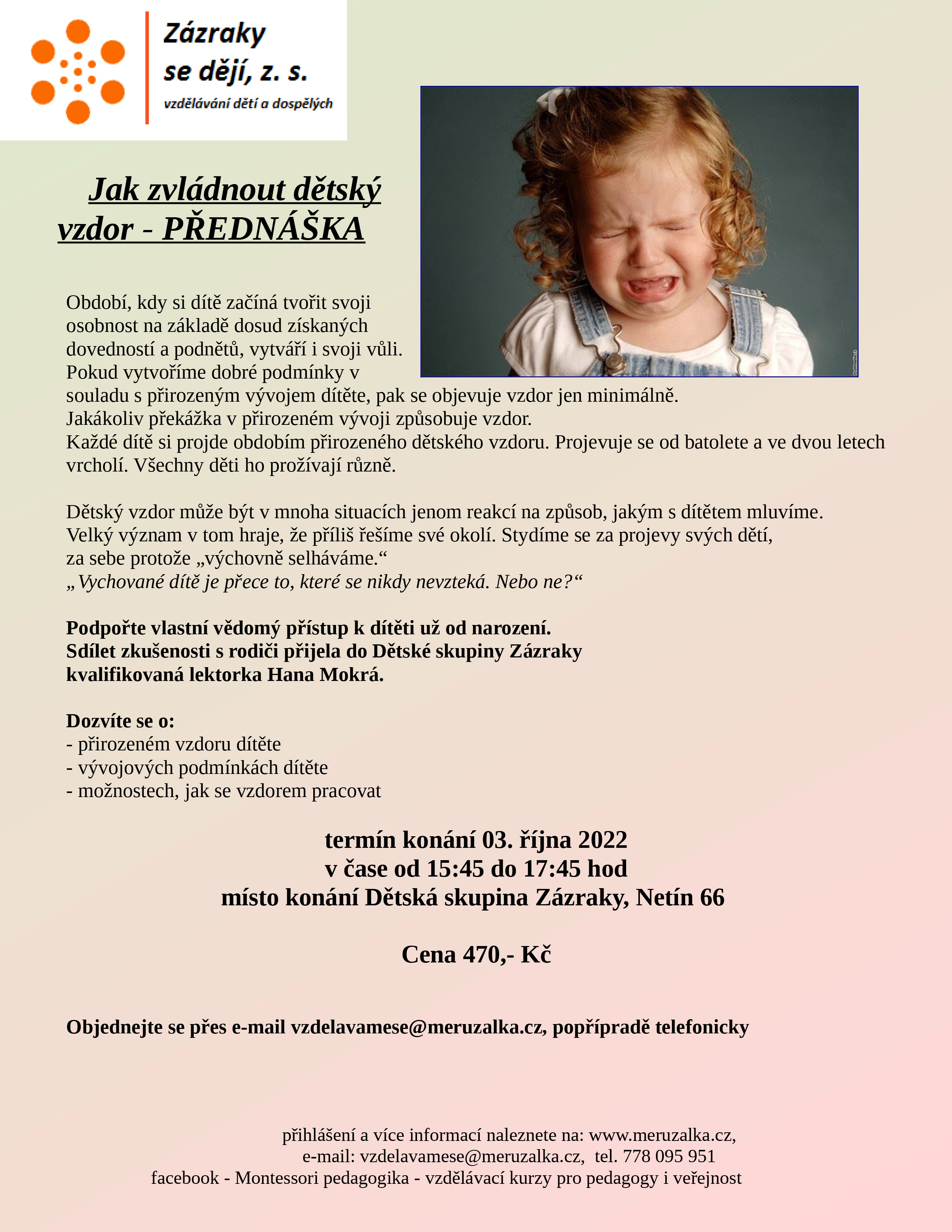 S trápením rodičů pomůže naučná přednáška lektorky Hany Mokré, která přijede 3. října do Netína. V čase od 15:45 do 17:45 bude sdílet své zkušenosti a diskutovat o již zmíněném tématu.