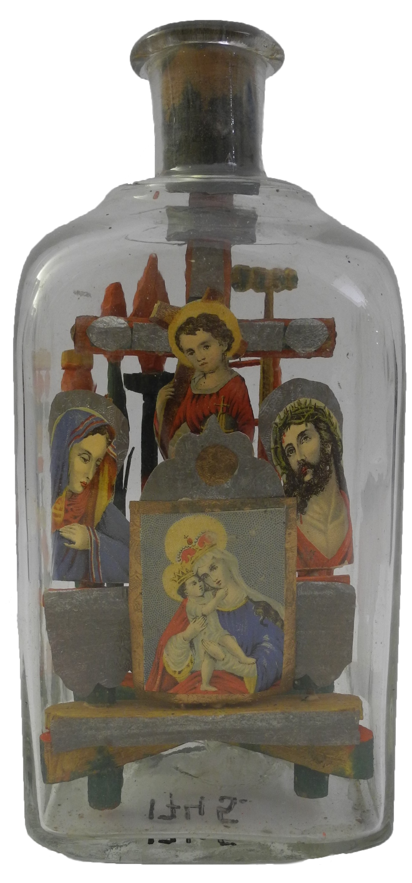 Pokud chtěli mít lidé doma kromě svatých obrázků či krucifixů i jinou připomínku Ježíše Krista, začaly se v domácnostech objevovat také kalvárie pod skleněným poklopem či přímo ve skleněných lahvích. Lidoví umělci často chodívali po kraji a svojí zručností se živili. Zručný řemeslník zašel do některého ze statků, požádal o lahvičku s úzkým hrdlem a o kousek suchého dřeva a dal se do práce. Jednoduchým kapesním nožíkem vyřezával symboly umučení Páně, vpravil je do lahvičky a pečlivě střeženým tajemstvím je uvnitř nejrůznějšími háčky a šídly sestavil, přičemž lahvičku následně uzátkoval. Práce byly velmi rozmanitého charakteru, způsob výzdoby se odvíjel od fantazie daného autora.