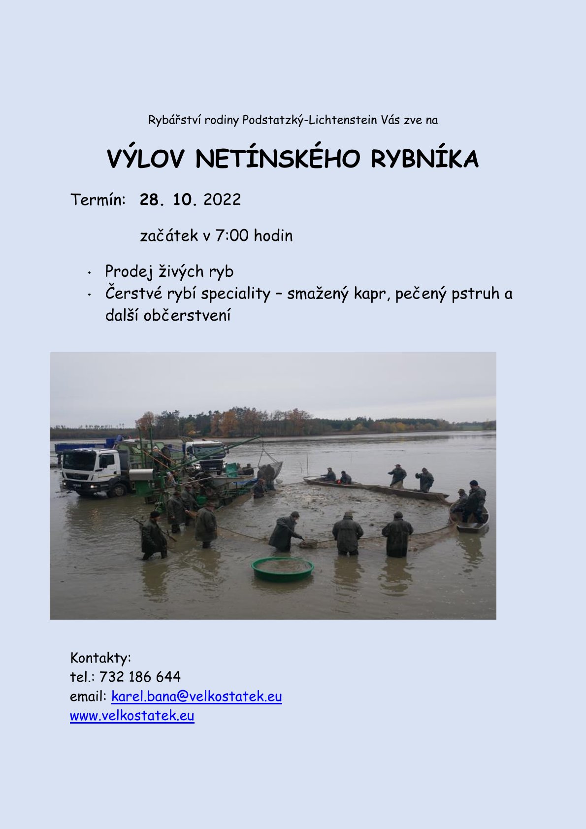 Rybářství rodiny Podstatzky-Lichtenstein zve na výlov Netínského rybníka v pátek 28. října od 7 hodin ranních. Kromě akční podívané si můžete zakoupit živou rybu nebo ochutnat rybí speciality v podobě smaženého kapra nebo pečeného pstruha.
