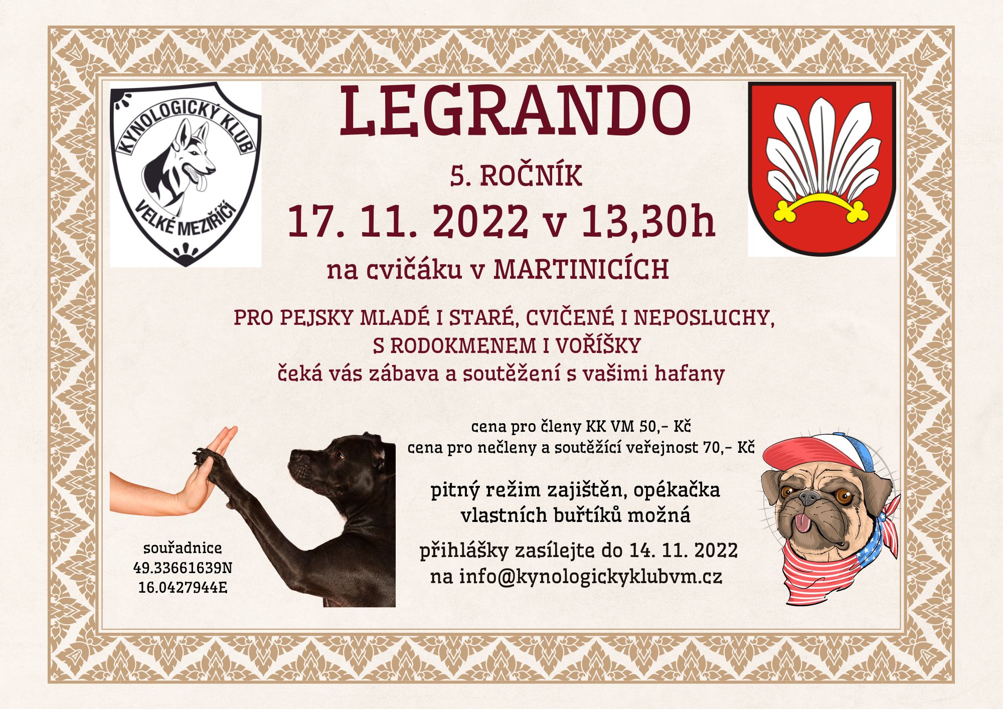 Ve čtvrtek 17. listopadu pořádá Kynologický klub Velké Meziříčí 5. ročník soutěžního dne Legrando na cvičišti v Martinicích. Vítány jsou všechny věkové kategorie, psi poslušní i neposlušní. Cena pro členy klubu činí 50 korun a pro ostatní 70 korun.