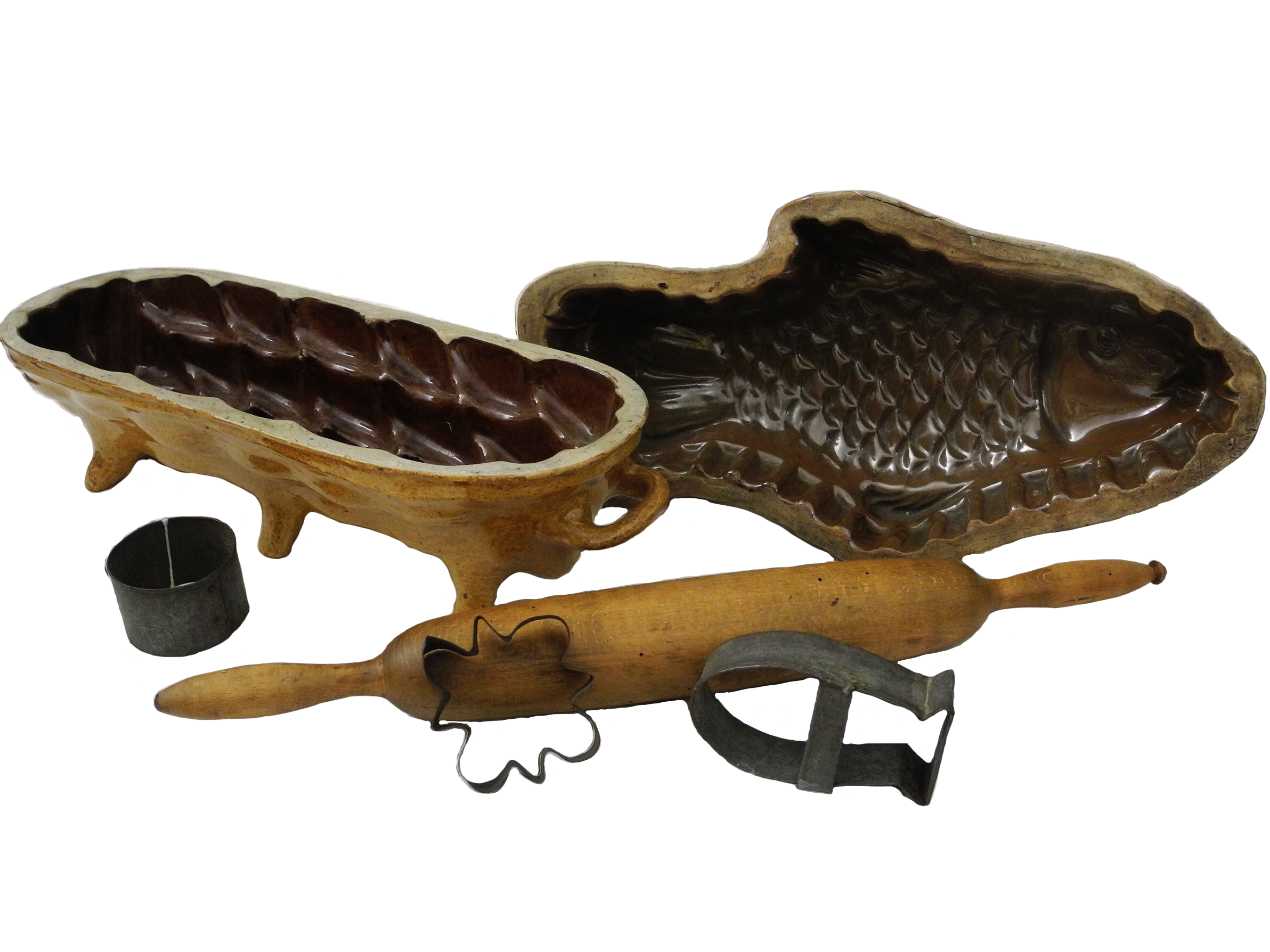 Když se řekne vánoční pečivo, většinou si vybavíme štědrovečerní vánočku. Dříve se splétaly pouze ručně, později byly vyráběny speciální formy, díky kterým bylo možné upéct štědrovni, jak se tomuto pečivu také říkalo, bez složitého pletení. Ve sbírkách máme těchto forem na vánočku hned několik. Dalším pro nás neodmyslitelným vánočním pokrmem je ryba, která ale byla v minulosti často zastoupena symbolicky pečivem právě v tomto tvaru. Jedna z forem ve tvaru ryby pochází dokonce z místní hrnčířské dílny rodiny Plachetských.