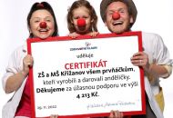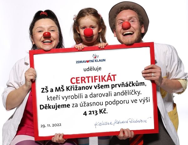 V křížanovské základní škole ale nesoutěžíme jen mezi sebou. Také „smíchuplně" pomáháme. Naši prvňáčci během projektového dne, kdy je navštívili zdravotní klauni, vyrobili andělíčky, které pak bylo možno nejen obdivovat na Kateřinském jarmarku v Sokolovně. Návštěvníci jarmarku si za dobrovolný příspěvek mohli andělíčka odnést domů, a přispět tak na dobrou věc – organizaci Zdravotní klaun. Na účet organizace putovalo 4 213 korun a prvňáčci získali Certifikát, na který jsme velmi pyšní. Jsme hrdí hlavně na to, že i tak malé děti dokážou pomáhat druhým.