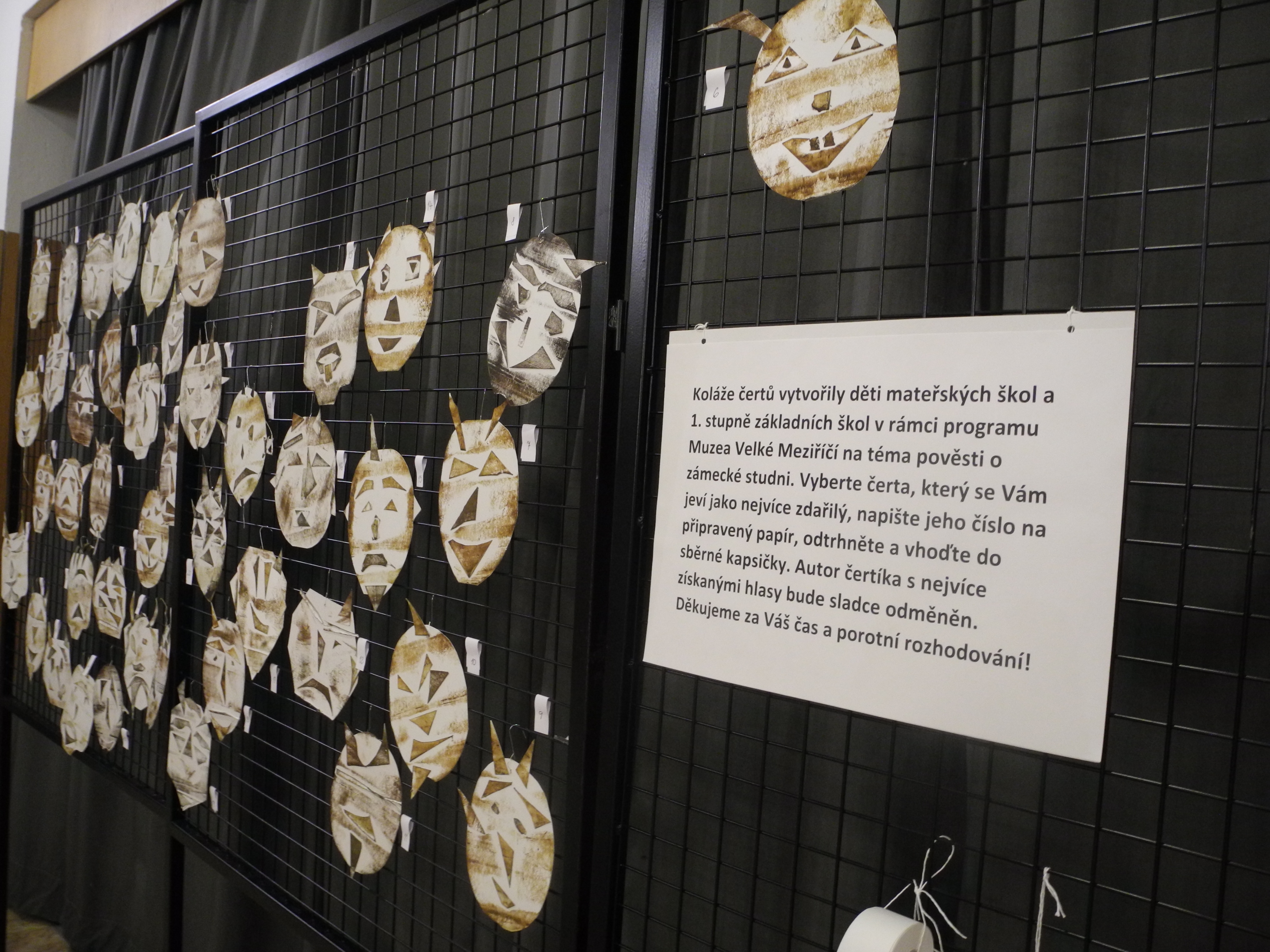 Koláže čertů vytvořily děti mateřských škol a 1. stupně základních škol v rámci programu Muzea Velké Meziříčí na téma pověsti o zámecké studni. Vyberte čerta, který se Vám jeví jako nejvíce zdařilý, napište jeho číslo na připravený papír, odtrhněte a vhoďte do sběrné kapsičky. Autor čertíka s nejvíce získanými hlasy bude sladce odměněn.